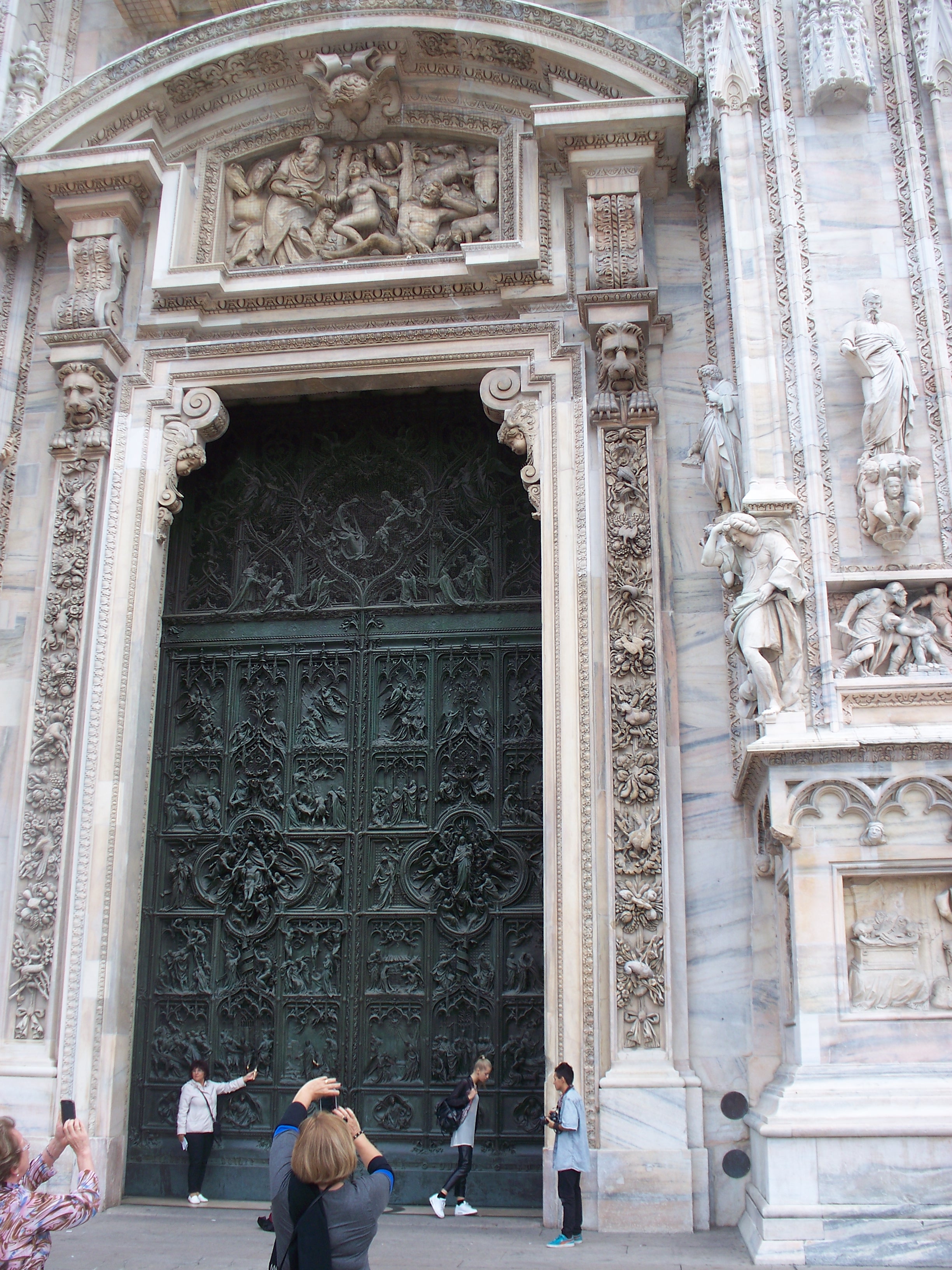 Scendiamo gli scalini e ci ritroviamo in una via piena di gente. Cerchiamo invano i resti dei muri laterali che chiudevano la piazza. Di fronte osserviamo il Palazzo dei Giureconsulti. Ricambiamo lo sguardo (il suo molto austero) di Sant’Ambrogio che dall’alto della sua statua ha visto i cambiamenti di questa città. D’altra parte questa statua di cambiamenti ne ha visti anche di “personali”. In epoca rinascimentale era la Giustizia, poi le varie dominazioni (spagnola, austriaca, napoleonica, nuovamente austriaca) l’hanno conservata, ma…le hanno cambiato la testa! È stata, per così dire, “riciclata”. Il busto è stato sempre lo stesso (in effetti ha forme un po’ opulente da matrona romana), ma la testa è stata via via quella della Giustizia, poi di Filippo II Re di Spagna, poi di Bruto, uccisore di Cesare. Tornati glia austriaci, dopo la parentesi napoleonica, la testa è diventata quella di Sant’Ambrogio, straniero sì, ma amato dai milanesi.