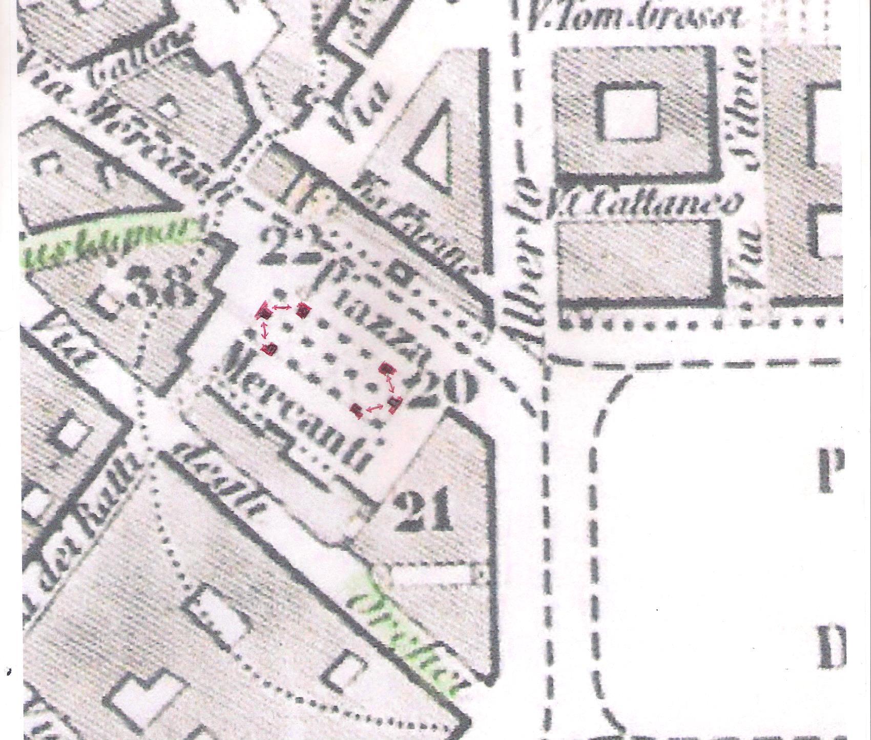 Ci fermiamo vicino al pozzo e ci immaginiamo la vivace vita del tempo. Saliamo ora i gradini ed entriamo nella Loggia dei Mercanti. Vicino alle colonne (quelle segnalate in rosso e con le frecce nella cartina) godiamoci il gioco degli echi: avvicinando la bocca alla colonna potremo conversare con un amico posto davanti alla colonna in diagonale. Provateci! Rimarrete sbalorditi!