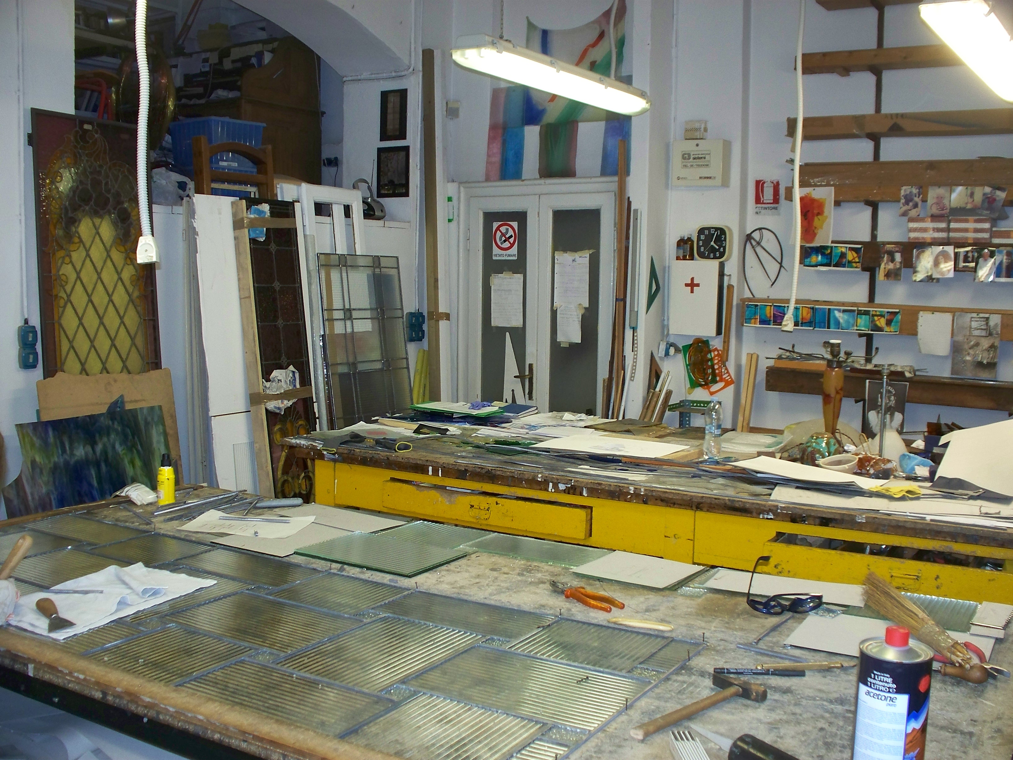 Entrare nel laboratorio è già un’esperienza unica, con colori, vetrate, attrezzi, camici bianchi, ma anche tante foto ricordo di lavori passati. Ci sono fogli ovunque e un gran numero di libri