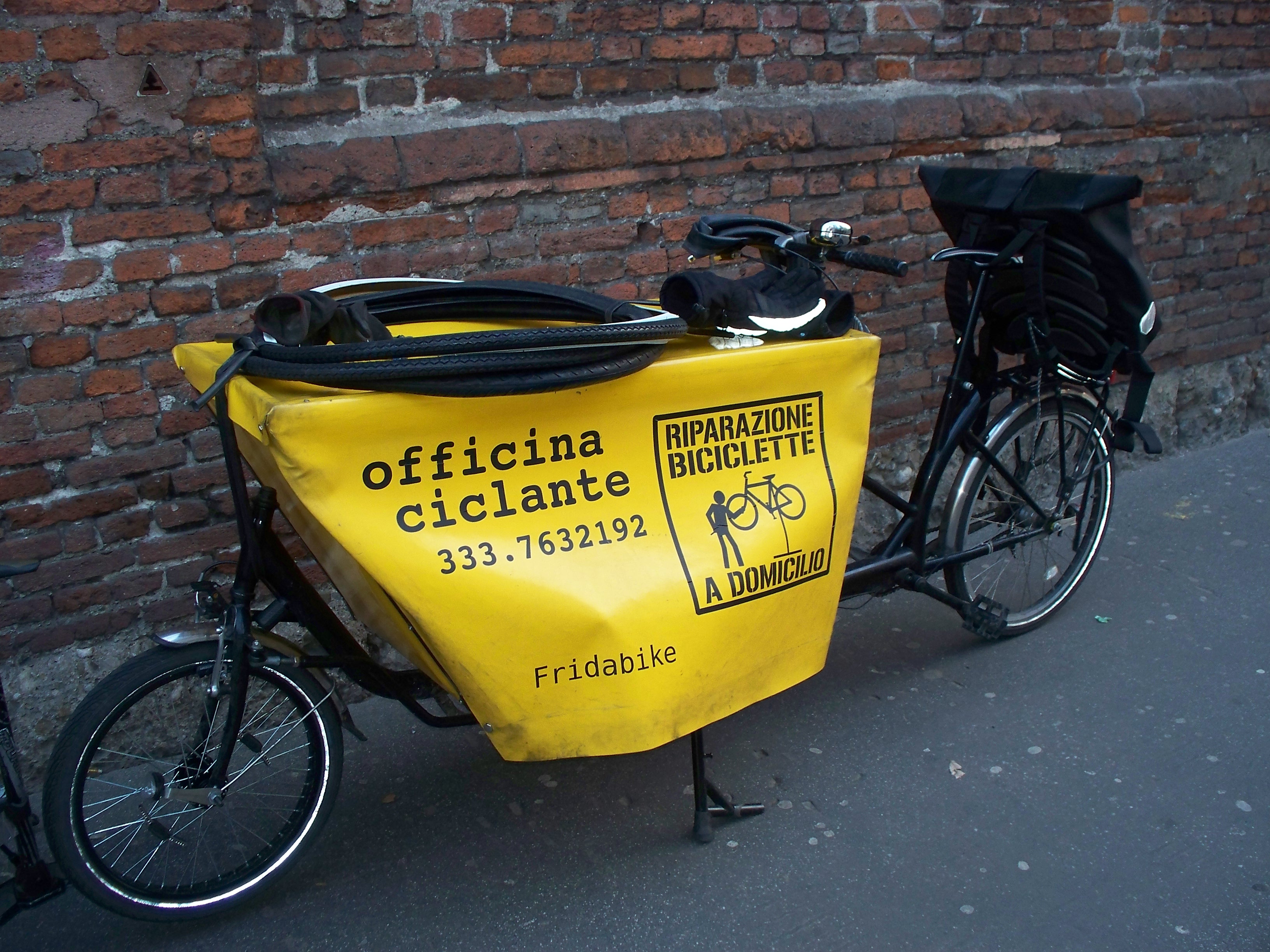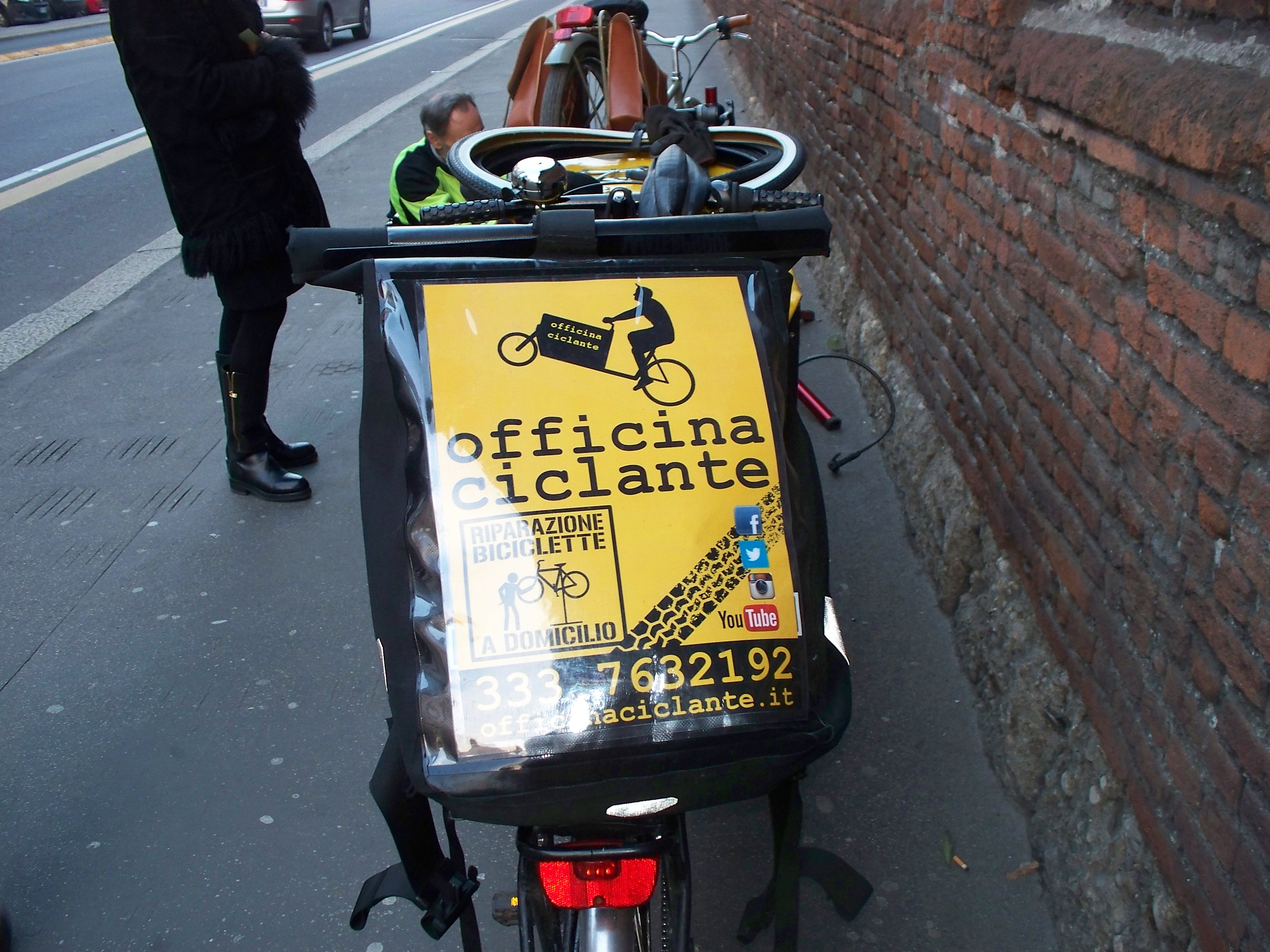Ieri, facendo quattro passi per Milano, abbiamo colto al volo l’ Officina Ciclante. Un gentile signore, munito di un’officina volante a pedali, aggiusta per strada o al vostro domicilio le biciclette.