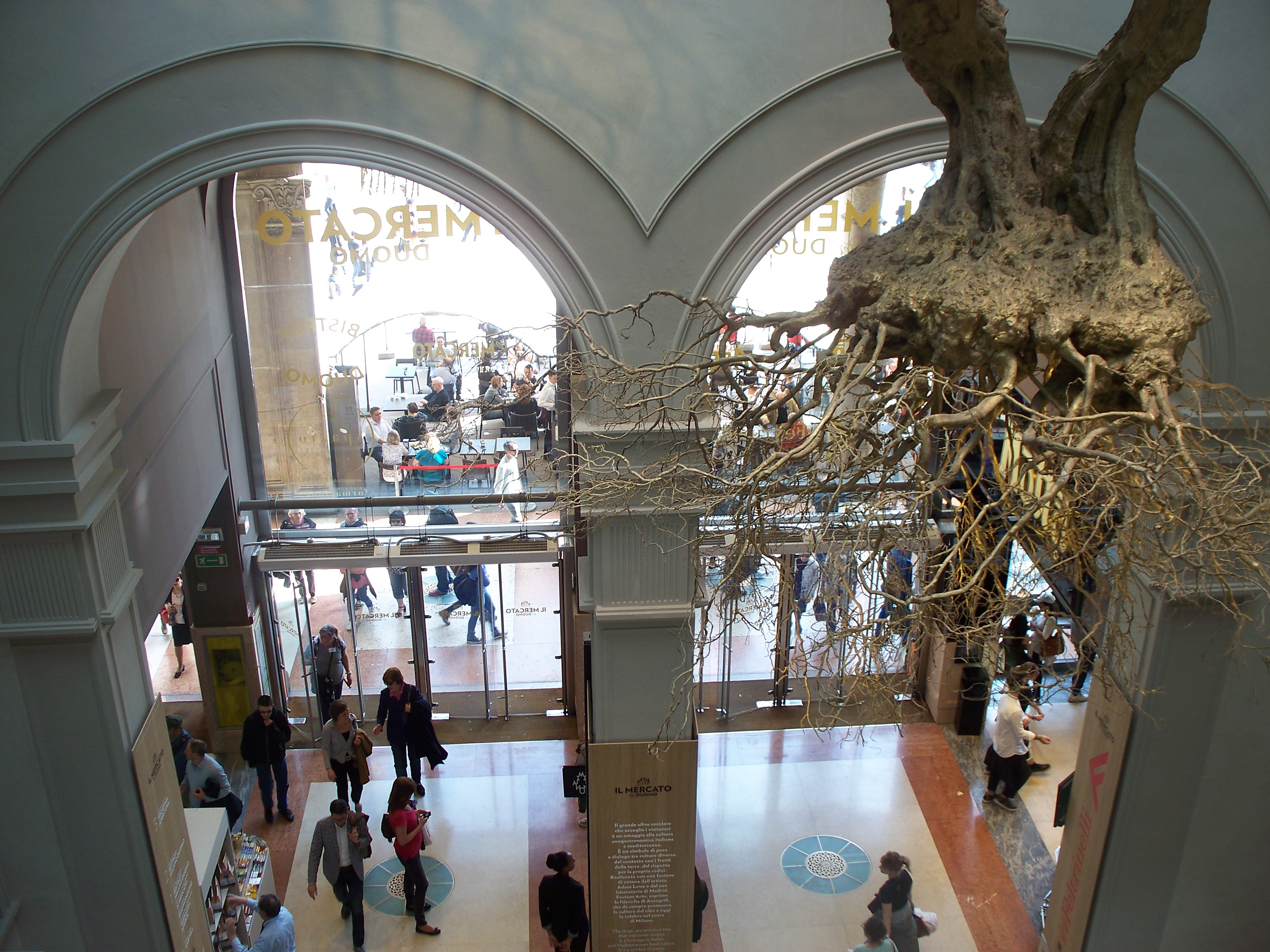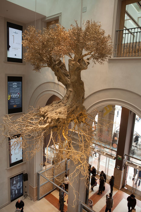 Scale mobili trasparenti accompagnano la salita dei clienti ai piani sotto il grande ulivo di bronzo, sospeso tra le vetrate, una scultura monumentale di forte impatto, che attira l’attenzione sulle radici, che forniscono nutrimento ad una pianta tipicamente legata alla gastronomia mediterranea.