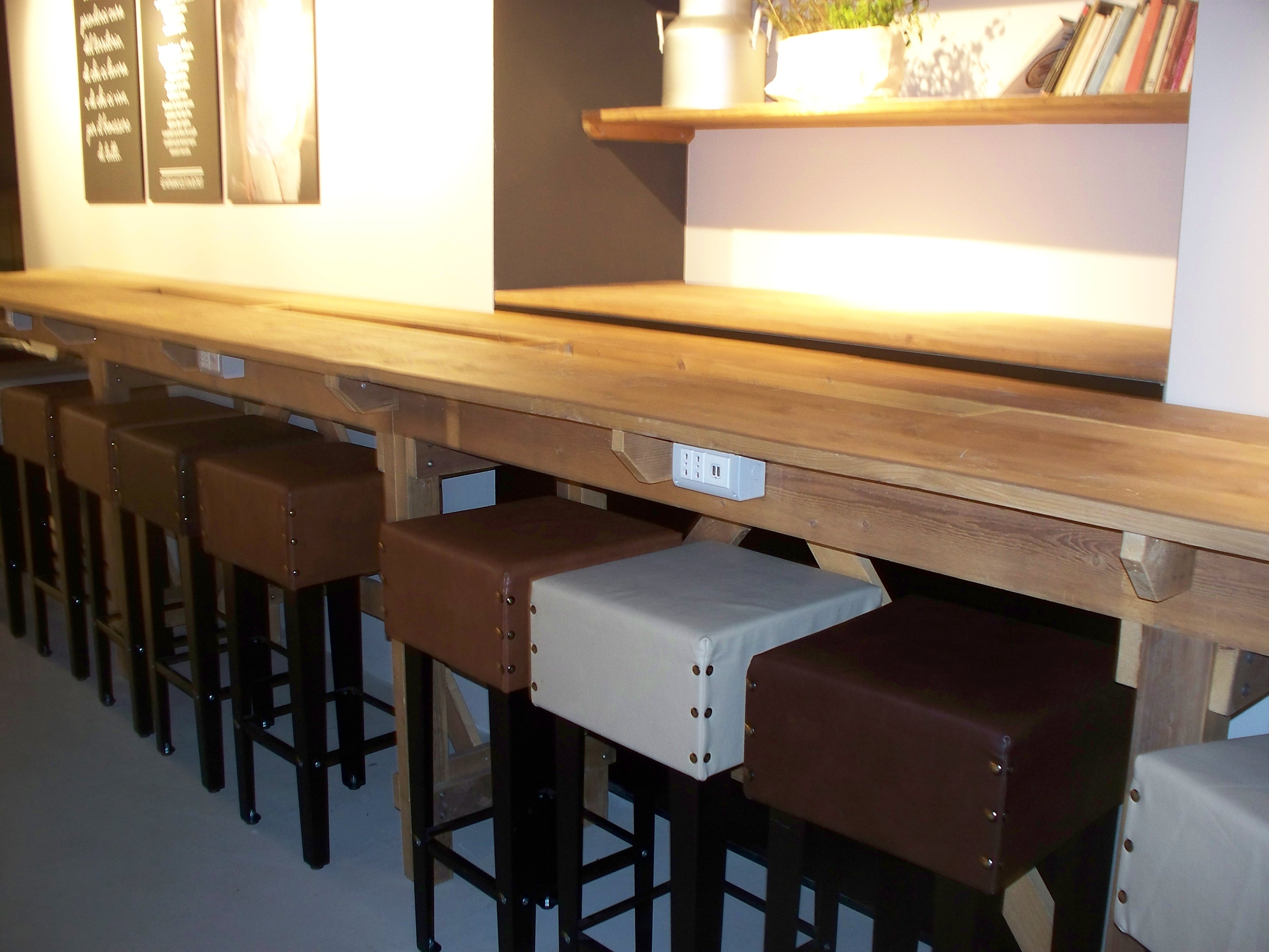 Qui tavolini e banconi, che forniscono connessioni, invitano a due chiacchiere o ad un momento “collegato”.