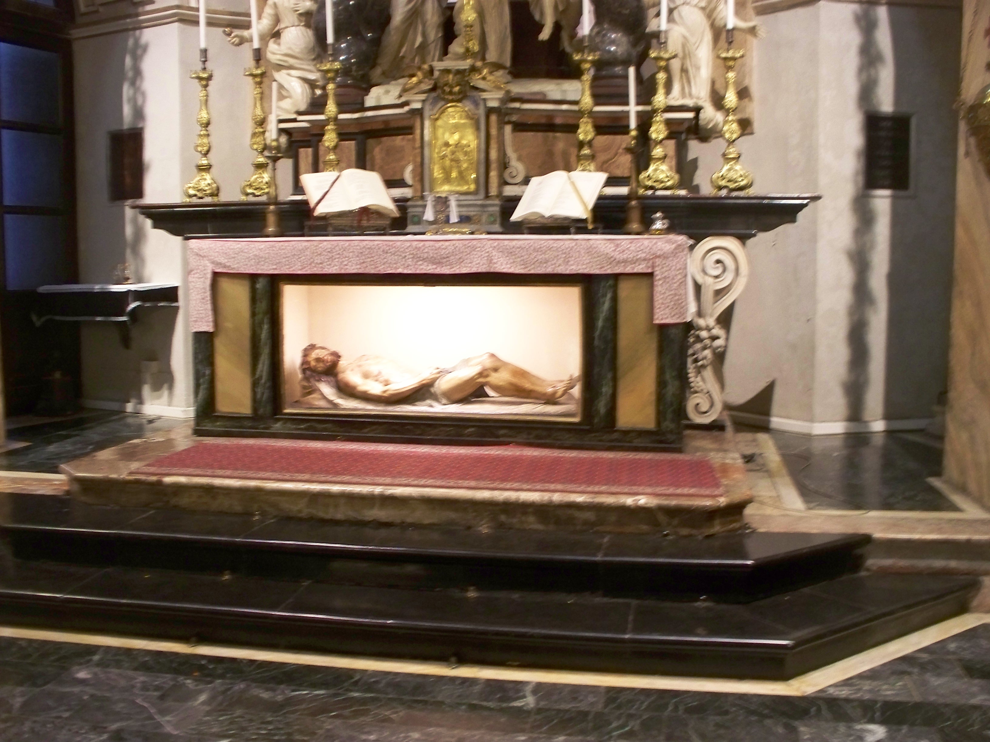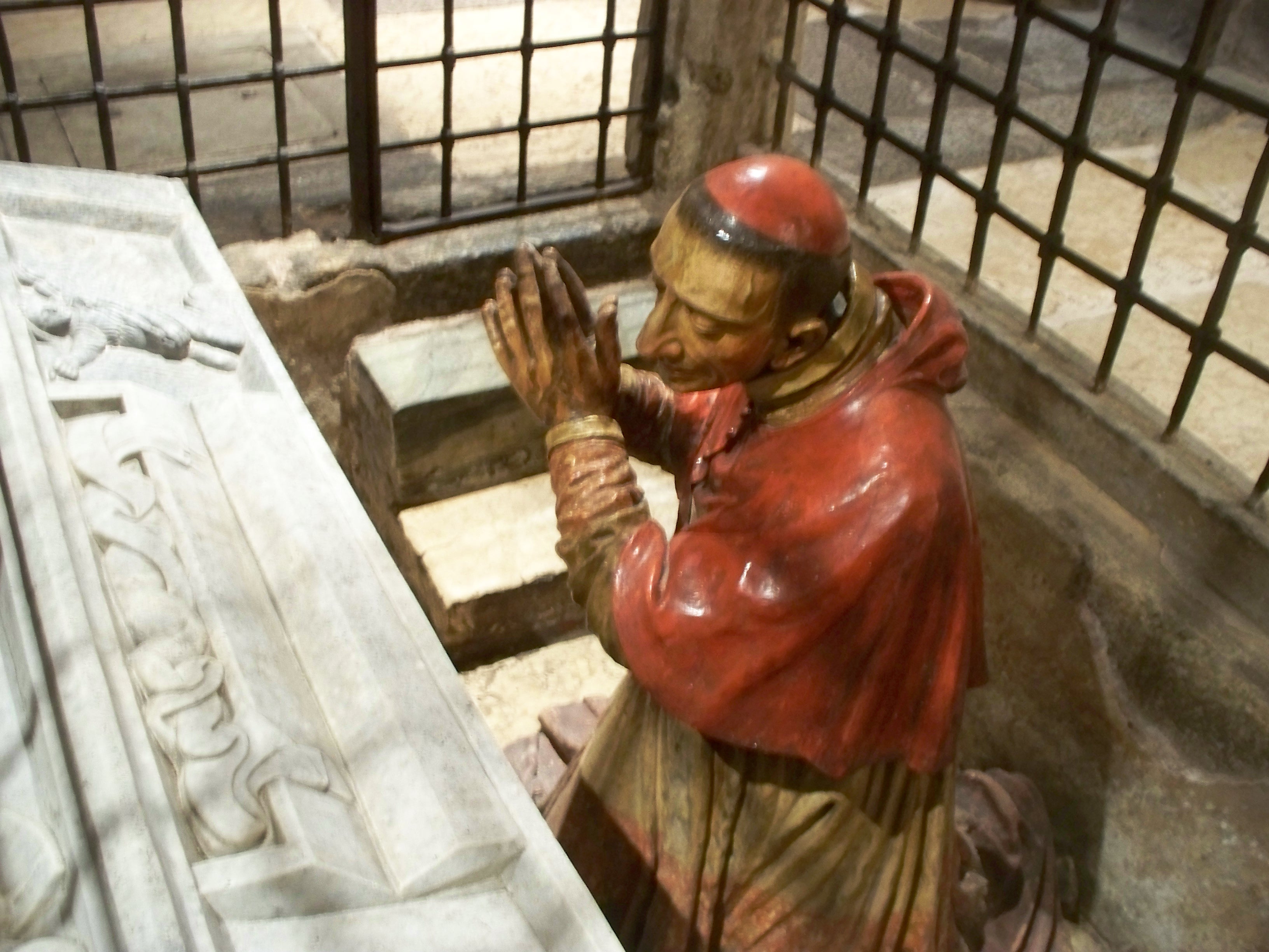 Una grata protegge il Sepolcro con una statua policroma di San Carlo inginocchiato in preghiera.