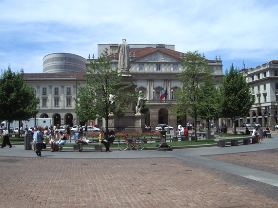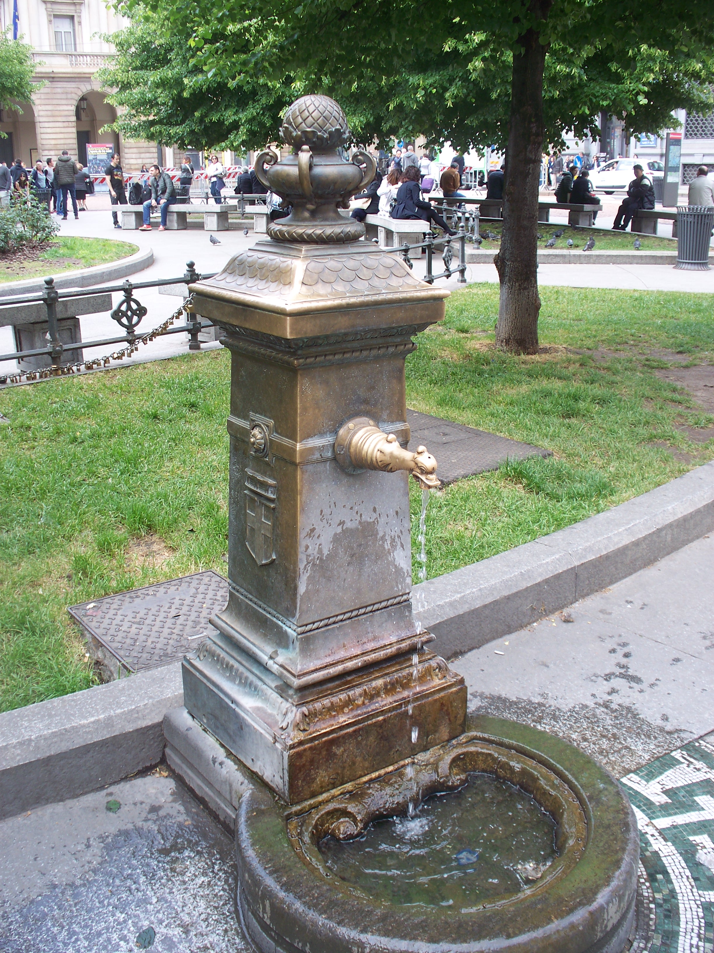 Ancora oggi, dietro alla statua di Leonardo e dei suoi quattro allievi (detta dai milanesi un liter in quater), la vedovella offre gratuitamente a tutti acqua fresca e potabile.
