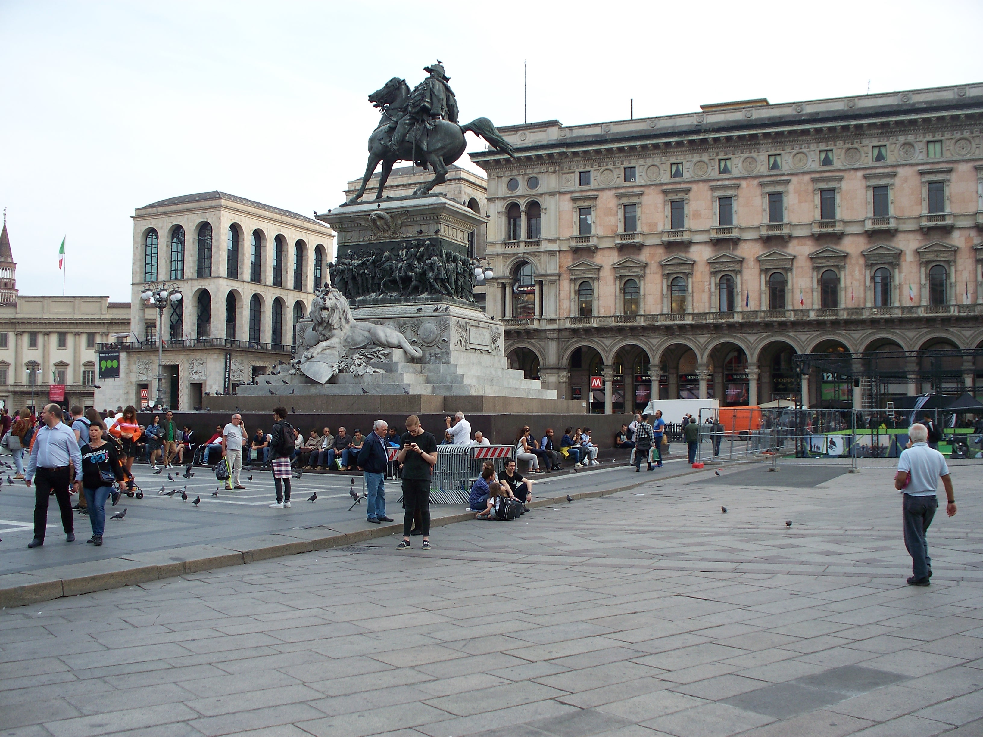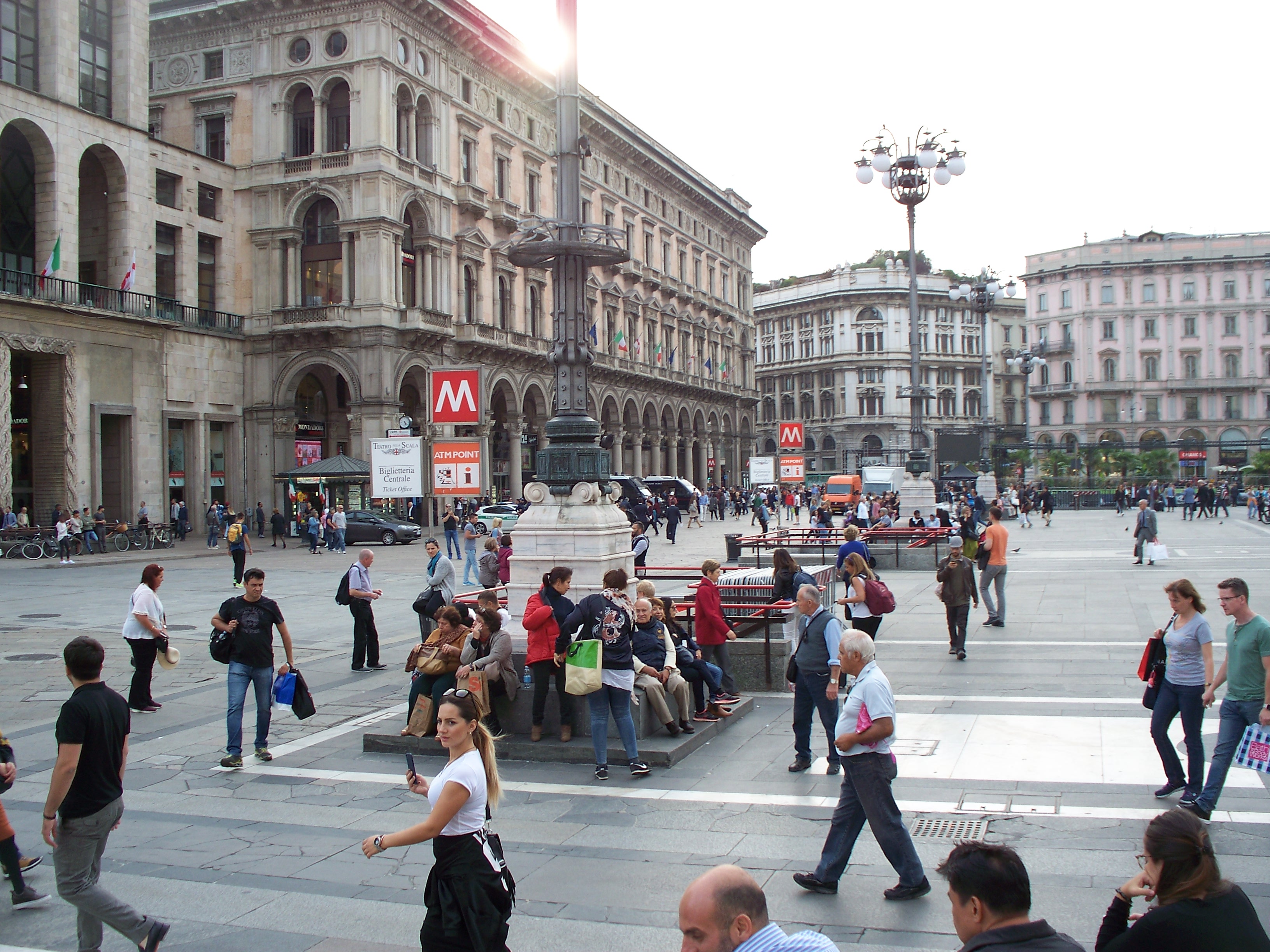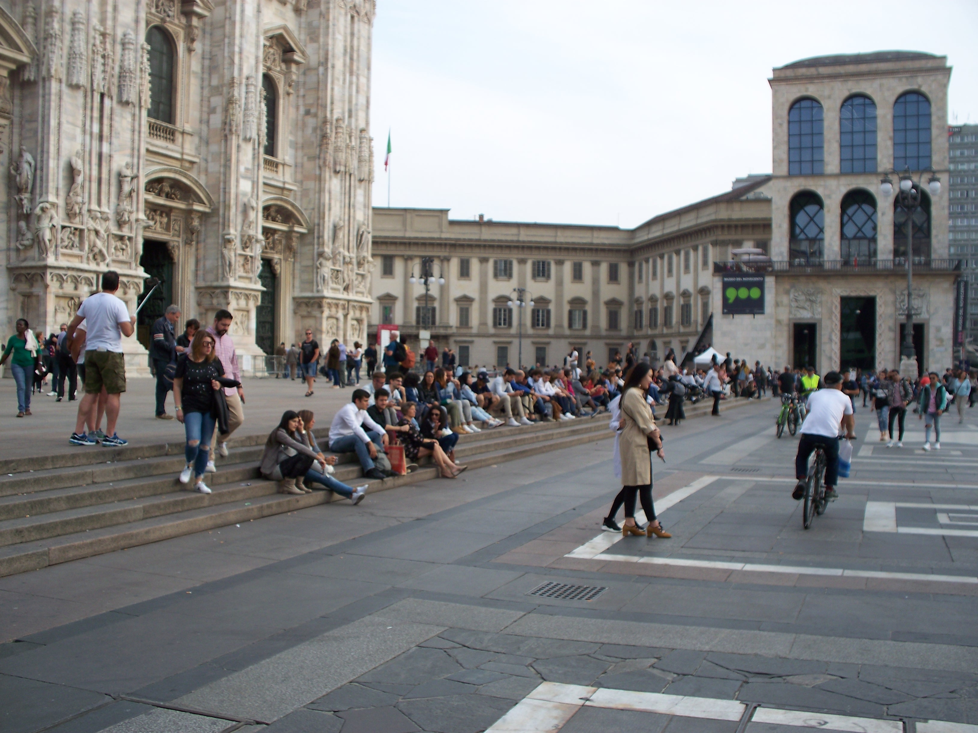 Difficile è sedersi in piazza Duomo che sembra fatta per essere attraversata in fretta dai milanesi ed ammirata con calma dai turisti. Pseudopanchine sono (ahimè) i gradini del Duomo con un tappeto umano che volta le spalle alla cattedrale ed i basamenti dei lampioni e del monumento a Vittorio Emanuele.