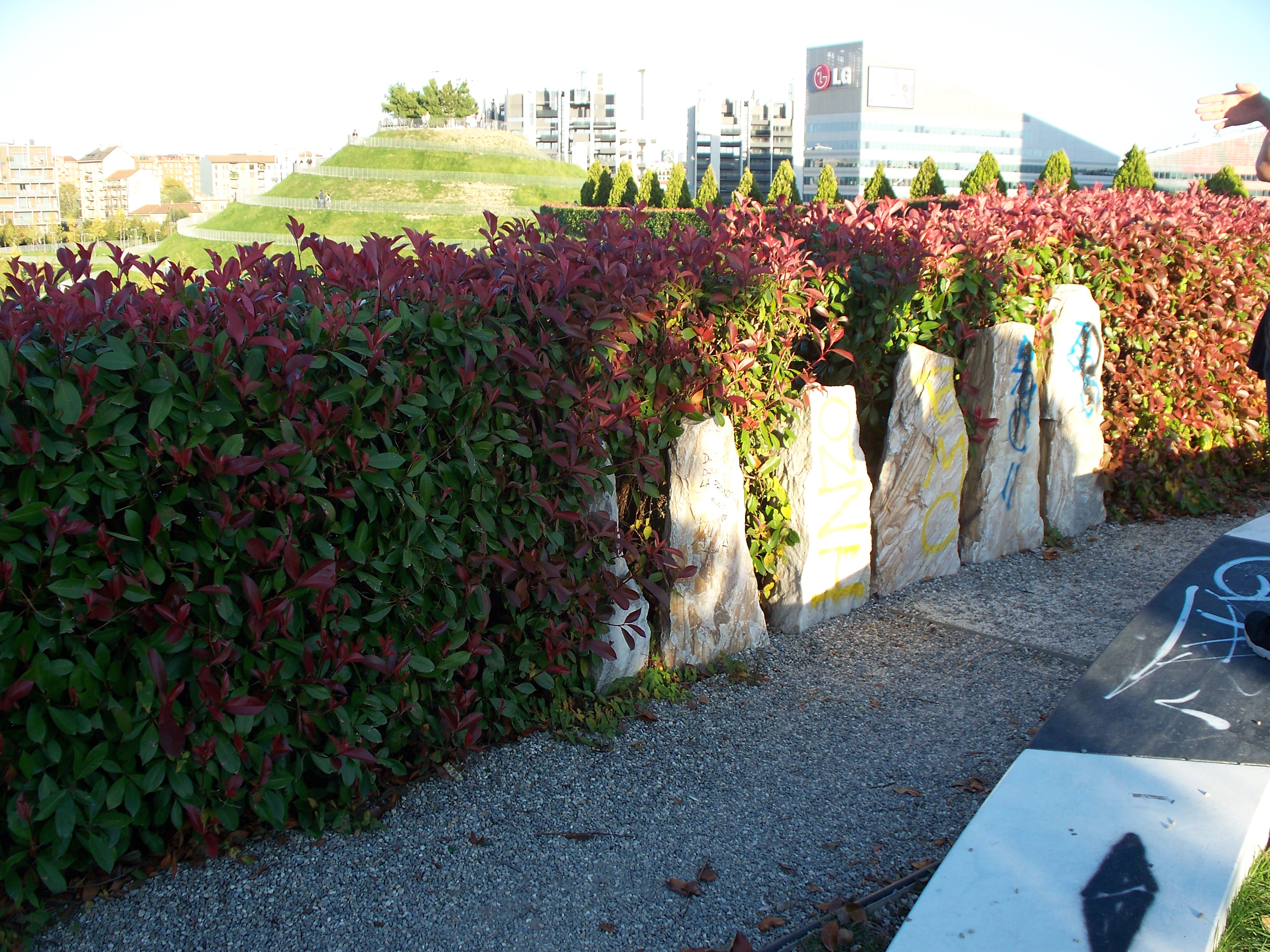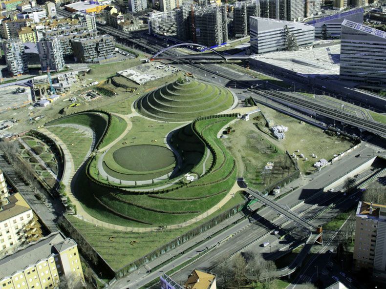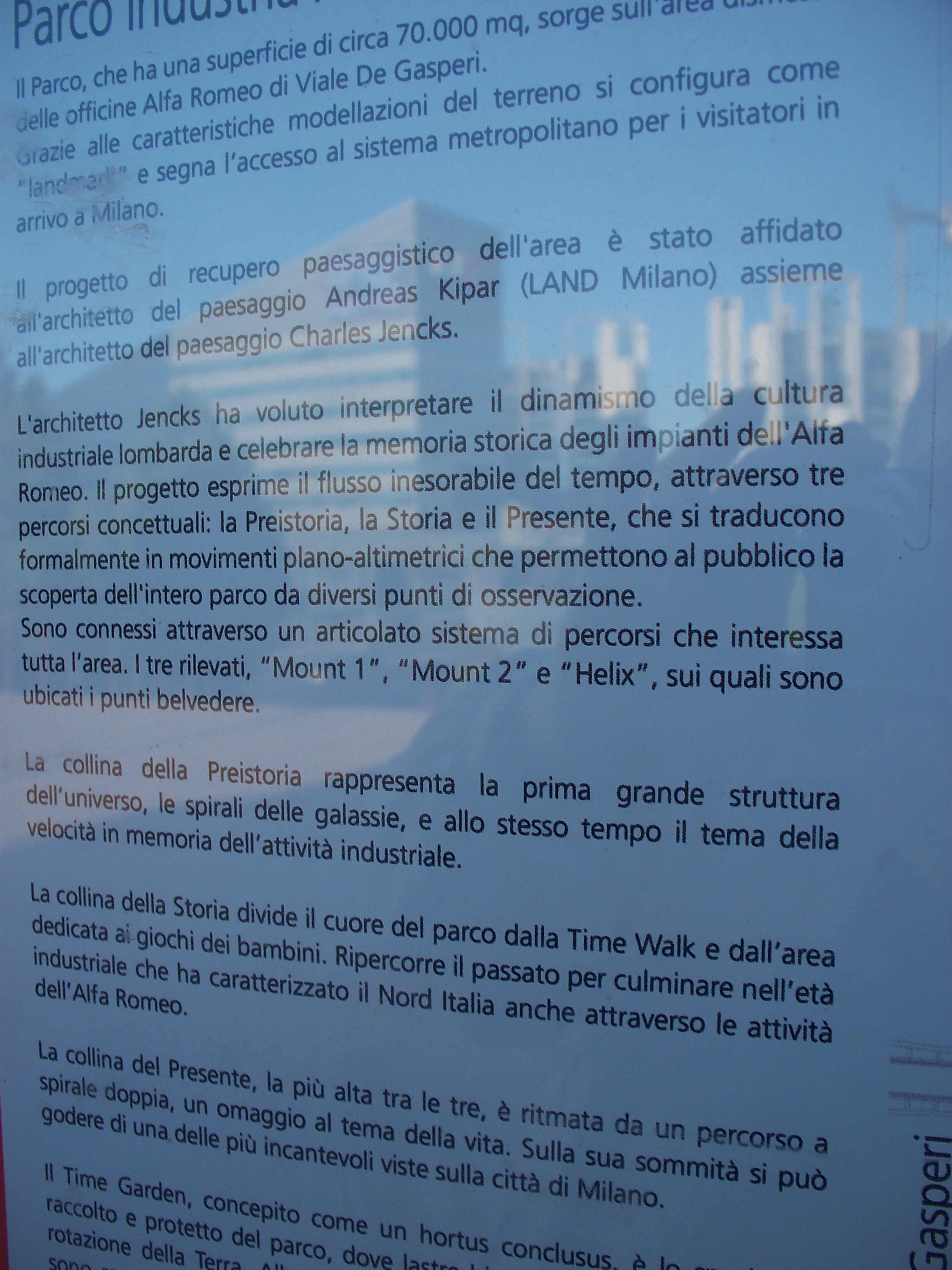 Le altre due collinette, che formano insieme una spirale, sono dedicate alla Preistoria e alla Storia. Sulla prima incontriamo dei mini menhir che portano i segni di graffiti contemporanei, mentre l’altra descrive i passi del progresso tecnico attraverso lastre che ricordano la produzione dell’Alfa Romeo. Filari di fitte siepi colorate accompagnano la nostra passeggiata nel tempo.