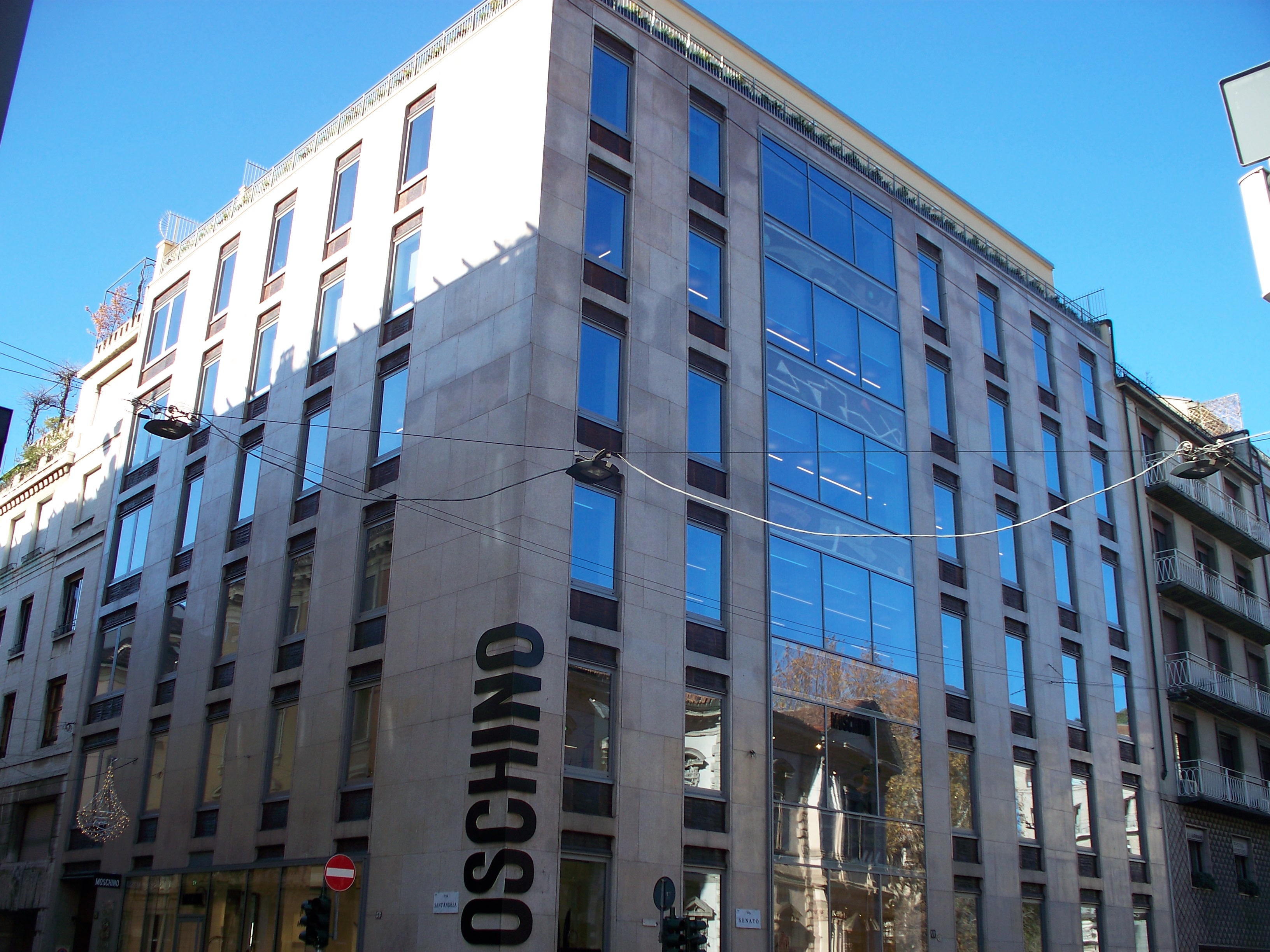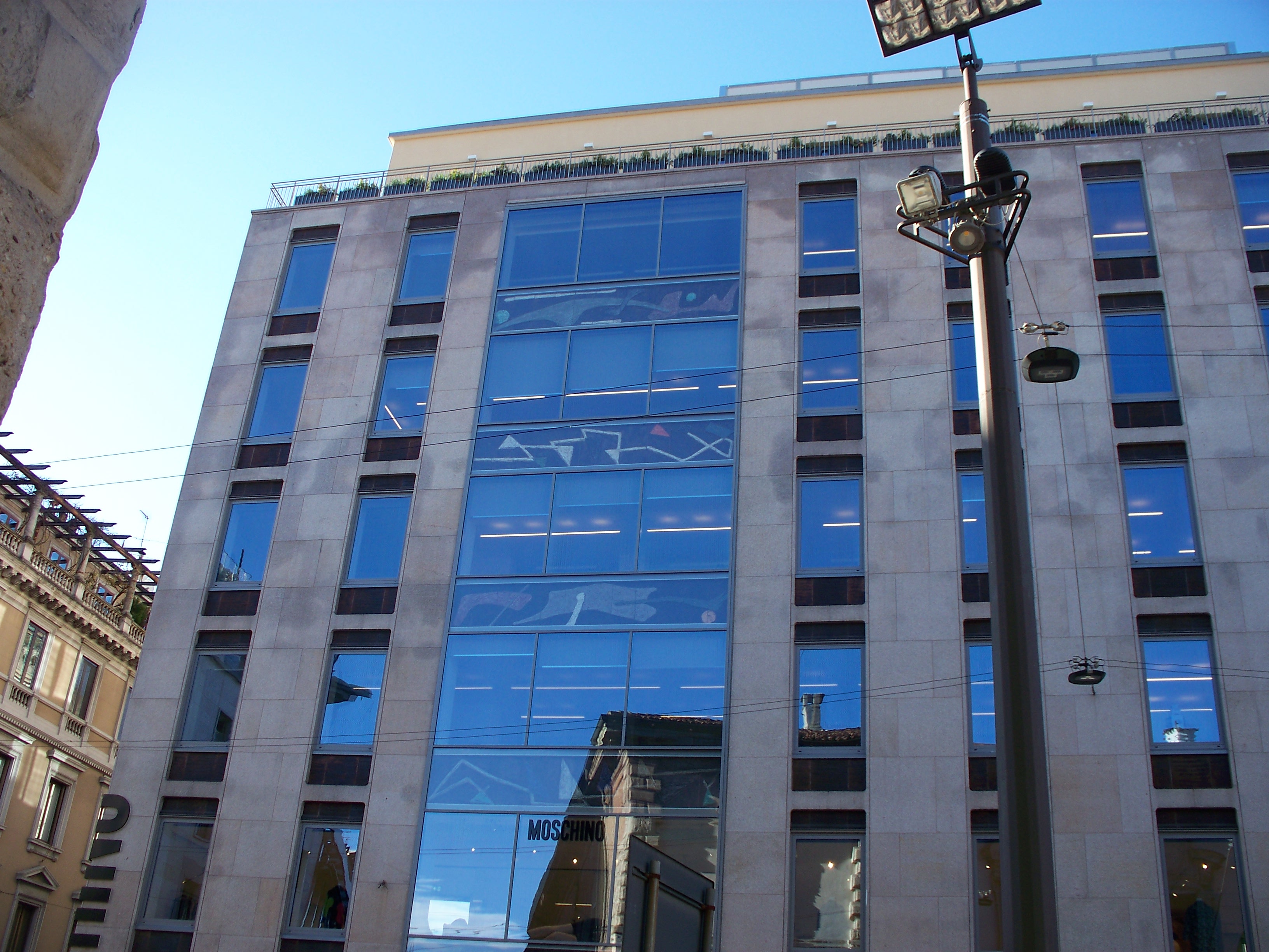 Di fronte al palazzo c’è un grande edificio per uffici, oggi Moschino. Sulla sua facciata, realizzata tra il 1947 e il 1949 anche da Marco Zanuso, spiccano delle fasce a motivi geometrici realizzate da Lucio Fontana.