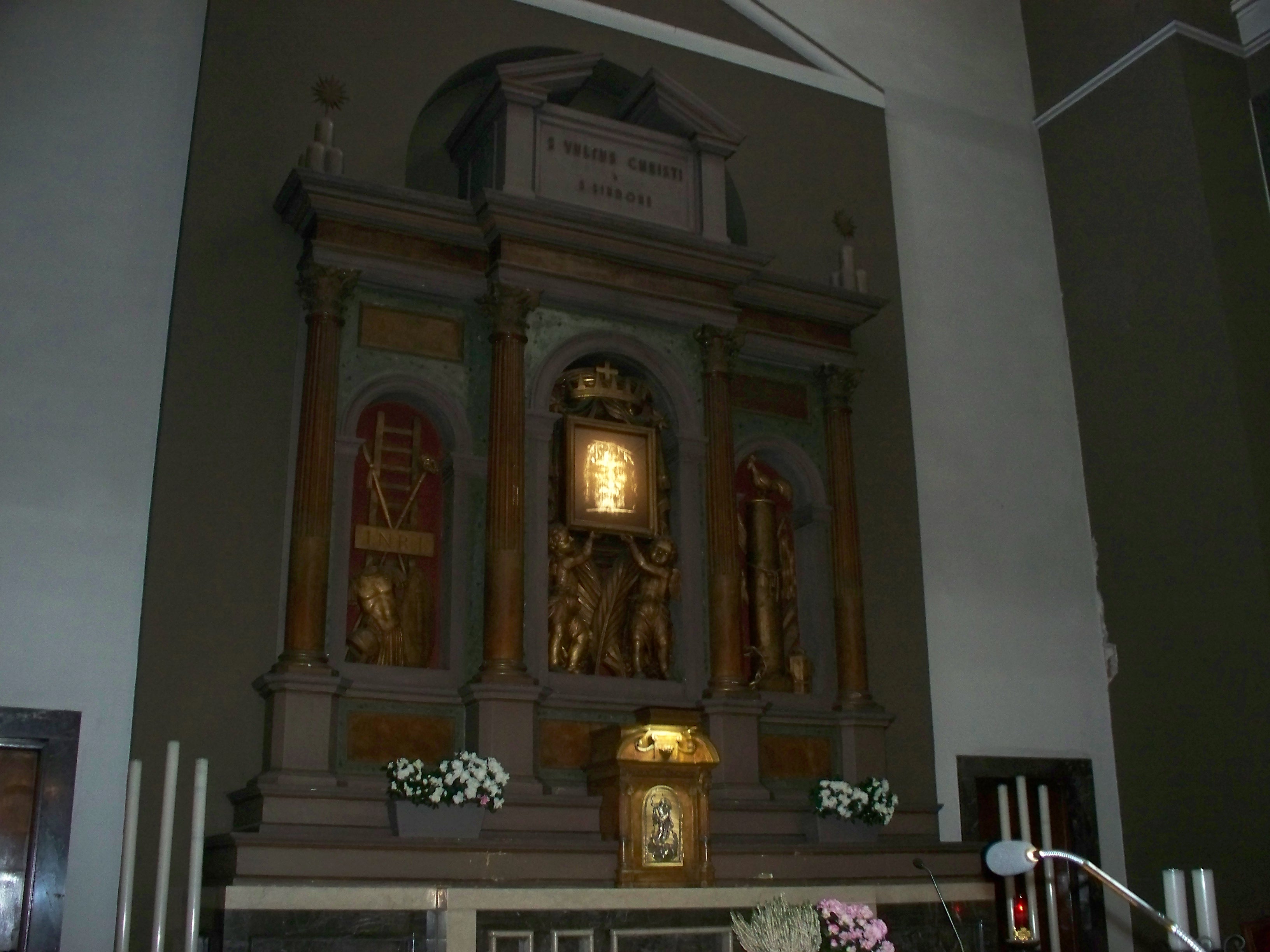 Guardiamo sopra l’altare di questa chiesa un’insolita opera d’arte: non un dipinto, ma la fotografia del Sacro Volto della Sindone.