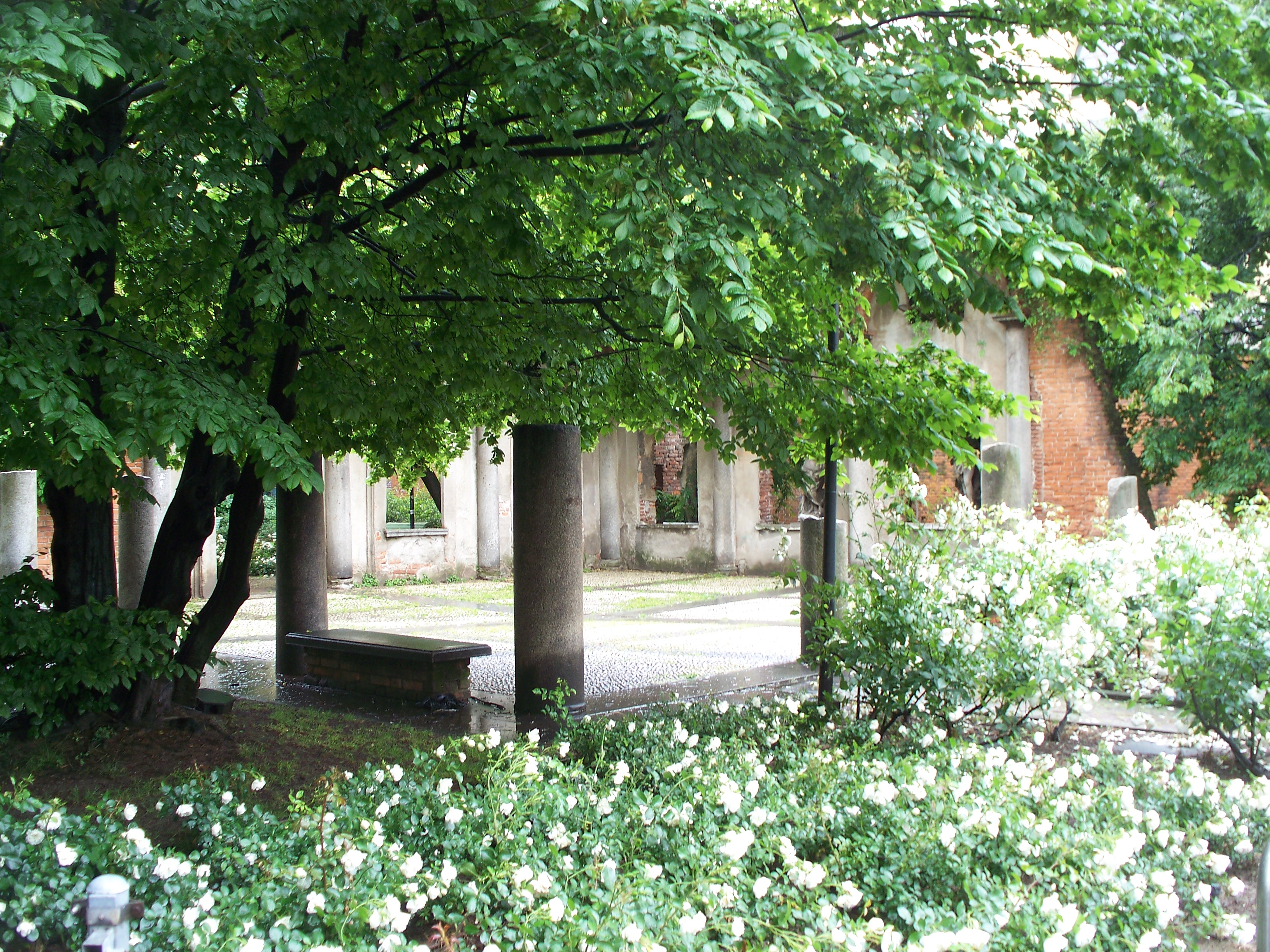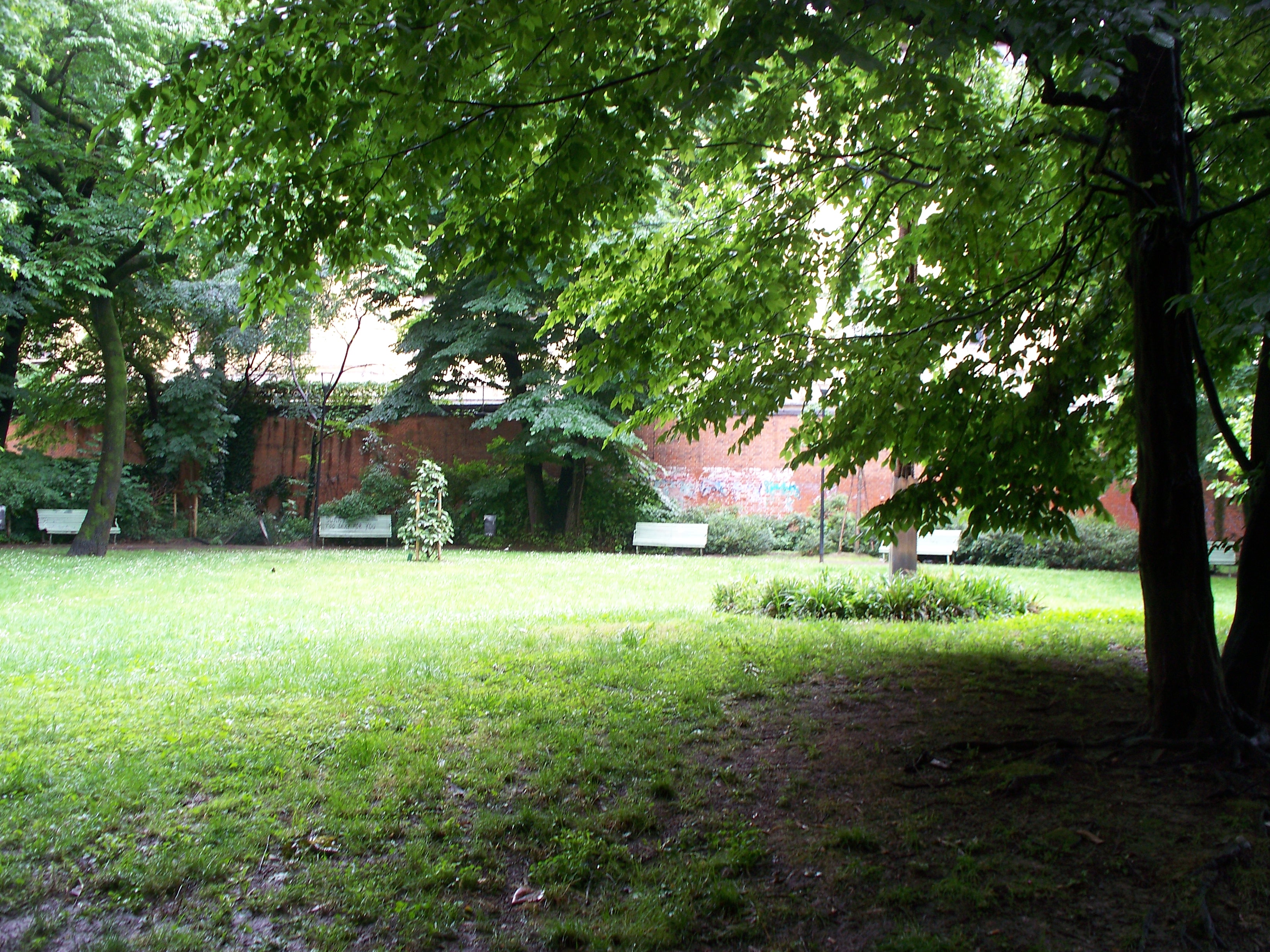 Questo giardino è nato dai bombardamenti che hanno distrutto il palazzo rinascimentale dove, forse, era nato Bernardino Corio, storico milanese ai tempi di Ludovico il Moro.