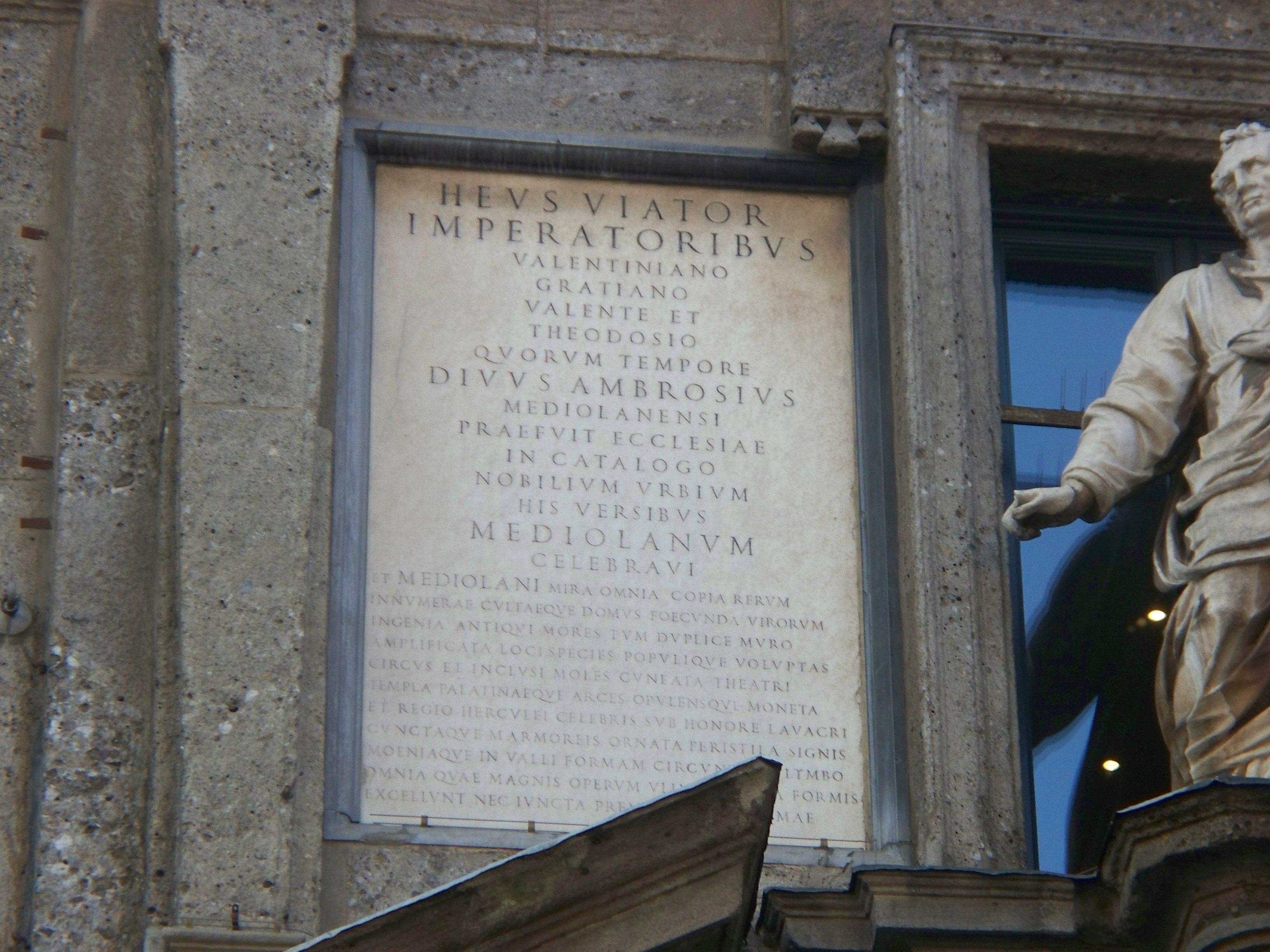 Lo scrittore fa della nostra città, che aveva visitato nel 379, una bellissima recensione, ponendo Mediolanum al settimo posto, seconda città italiana dopo Roma, tra le venti top urbes dell’Impero Romano. Un’epigrafe, accanto alla sua statua, è la sua rece che possiamo leggere anche oggi.
