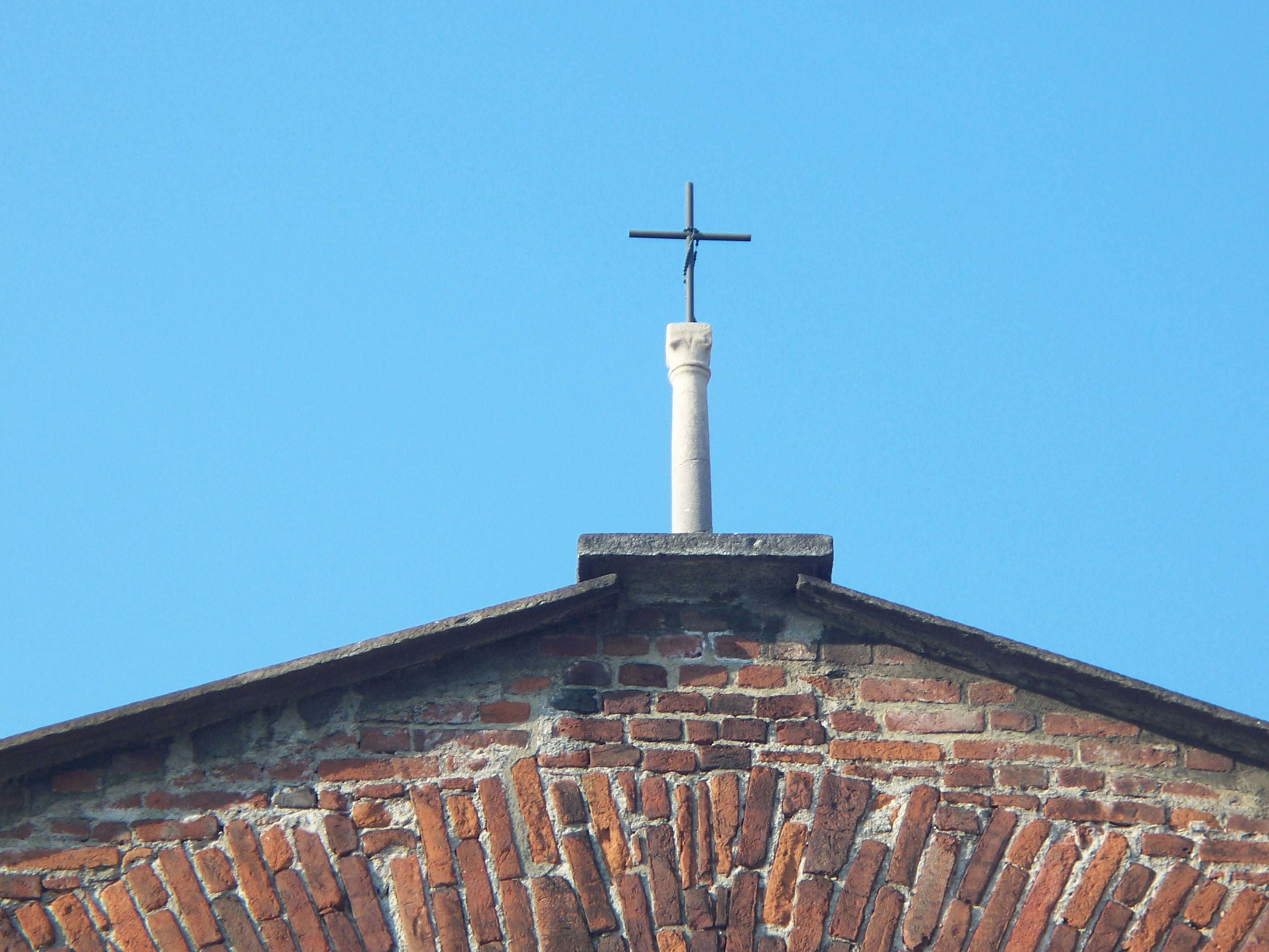 Sopra l’arco, al centro del colonnato, c’è l’intrusa: una piccola, solitaria colonnetta con la croce che fa spingere ancora più su il nostro sguardo. È la diciassettesima colonna.