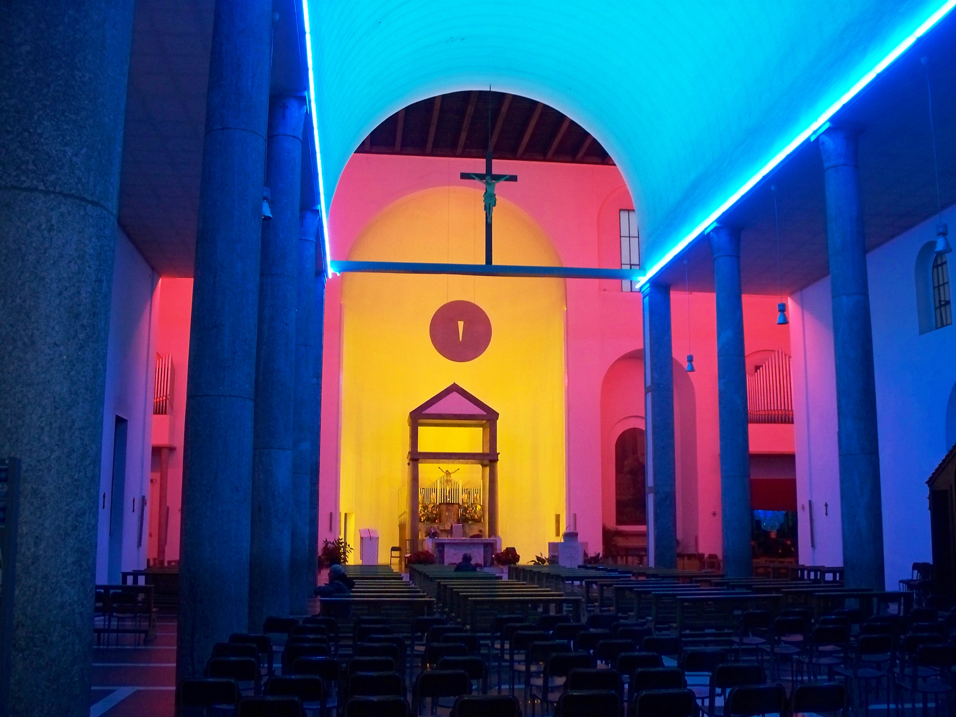 A questo progetto collaborarono anche diversi mecenati, fra cui la Fondazione Prada che ancora oggi continua a contribuire concretamente. L’interno di Santa Maria Annunciata è illuminato da tubi al neon di luce fluorescente che ridefiniscono gli spazi, ma non solo.