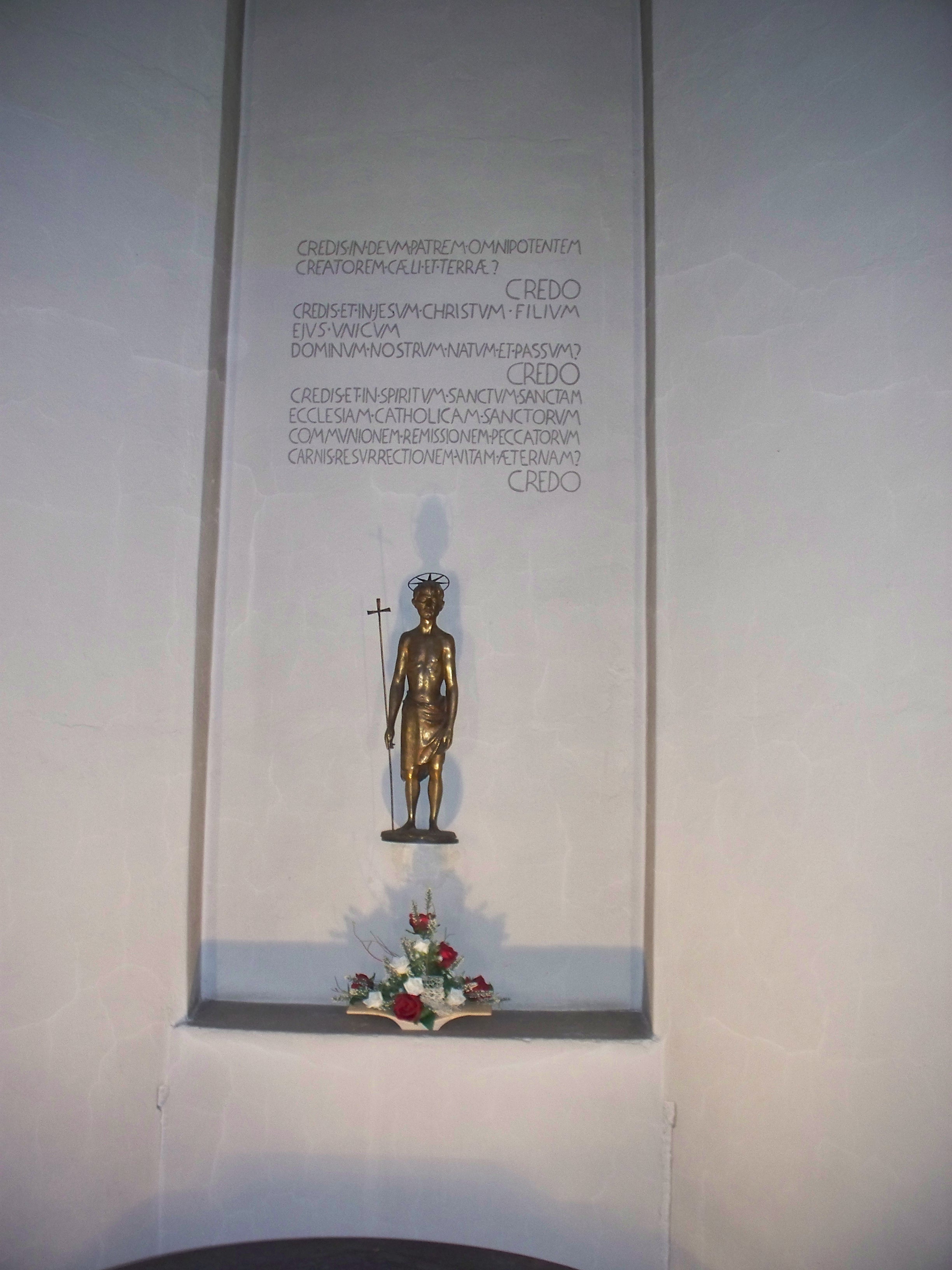 Nel battistero, ottagonale come da tradizione, c’è un’opera di Giacomo Manzù; mentre la cappella, dedicata a Maria, è rivestita in marmo, sembra contro il desiderio dello stesso Muzio. La statua della Madonna è stata realizzata da uno scultore di Ortisei, Giacomo Munster.