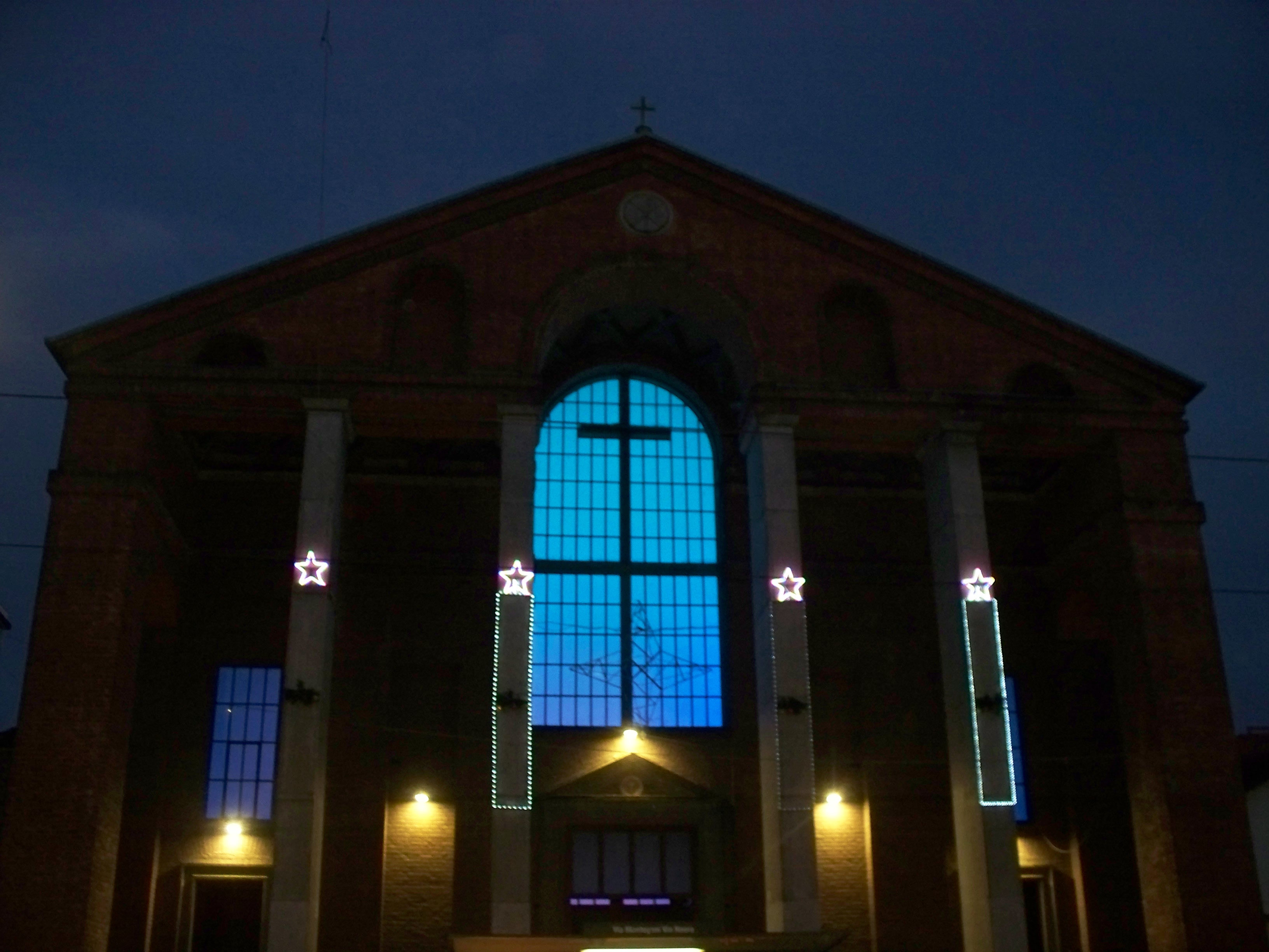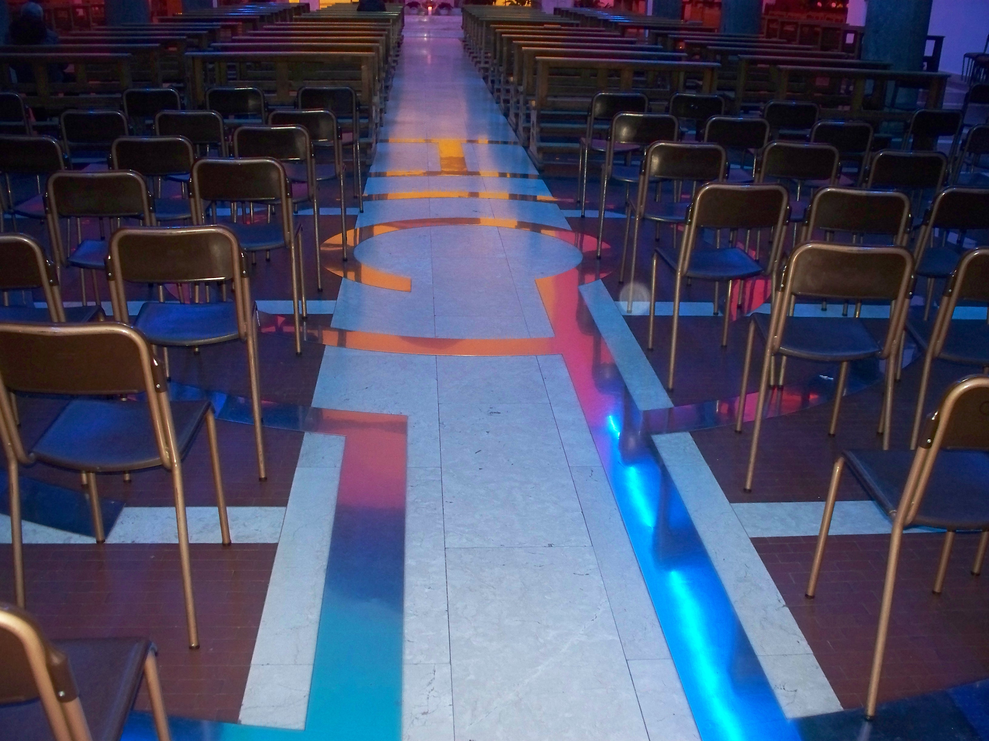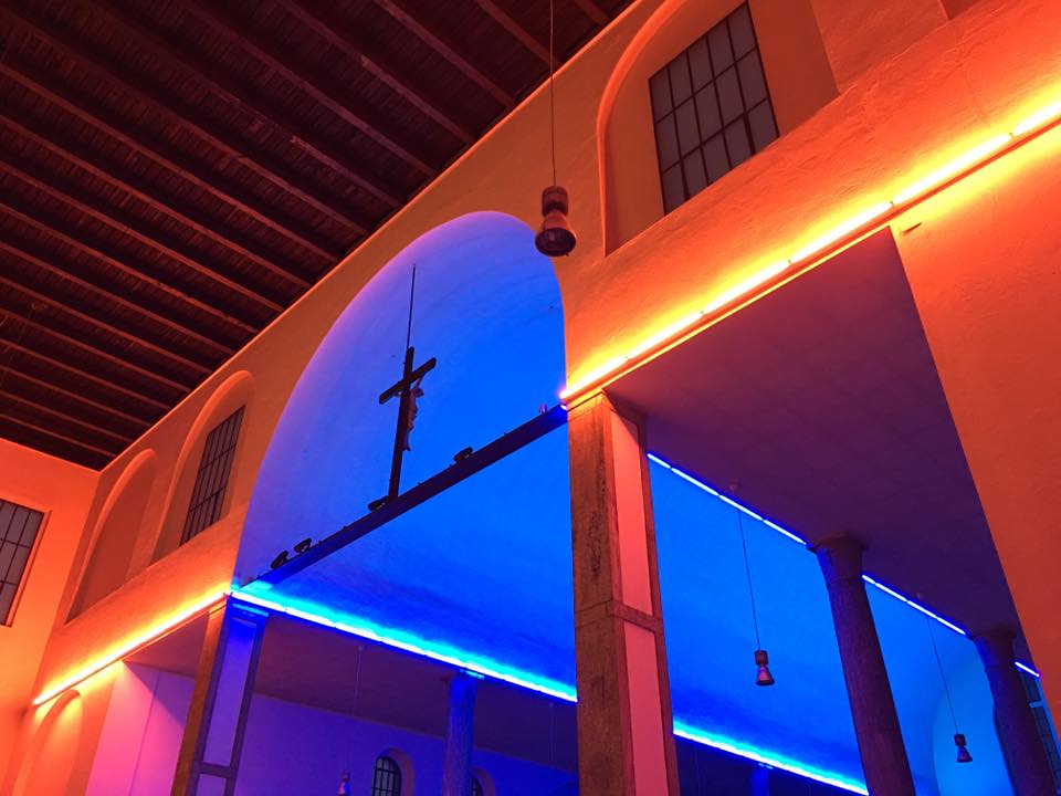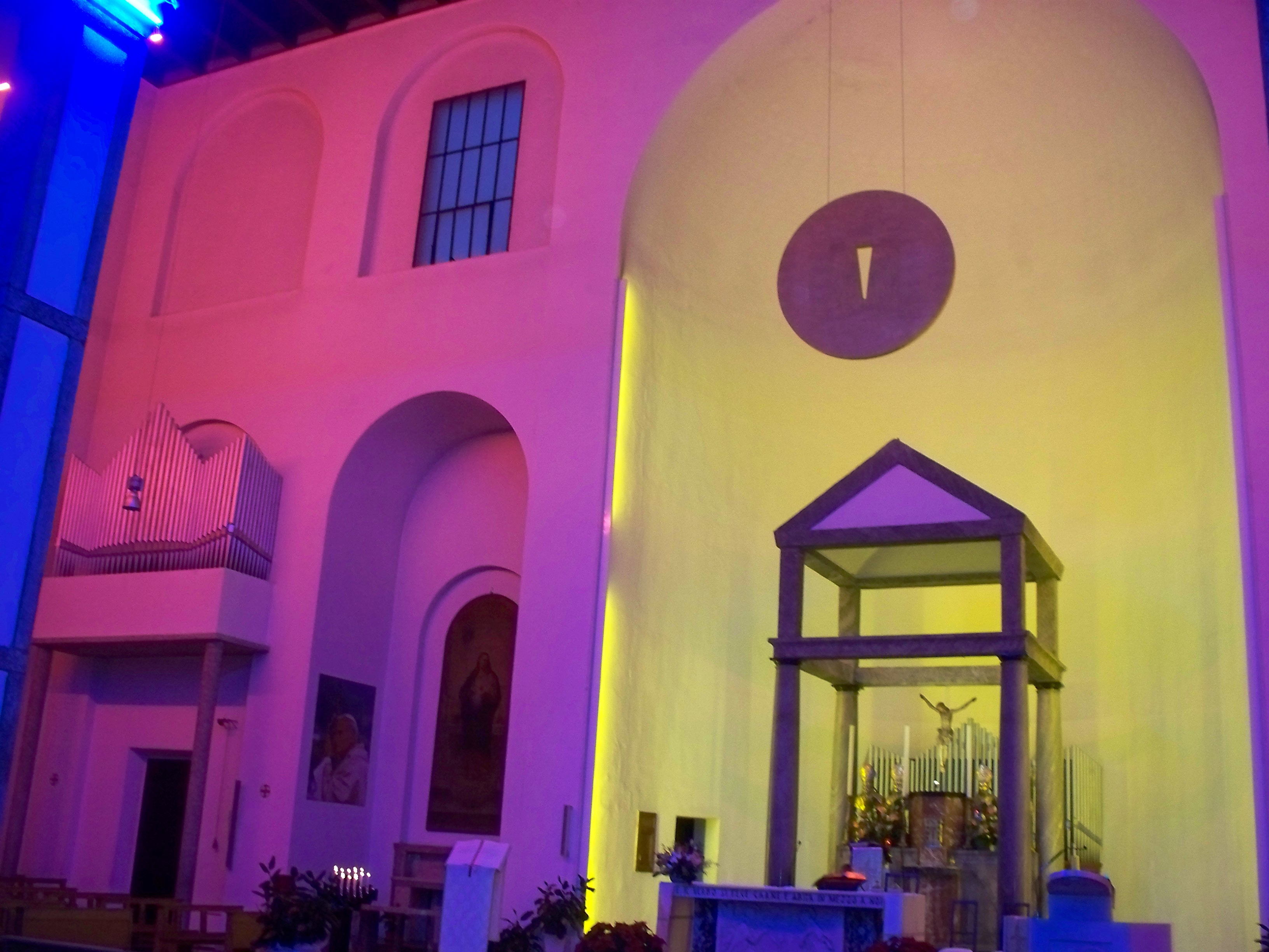 Se le antiche vetrate portavano i colori della luce all’interno delle cattedrali, in Chiesa Rossa è la luce della chiesa che esce all’esterno e ci chiama.