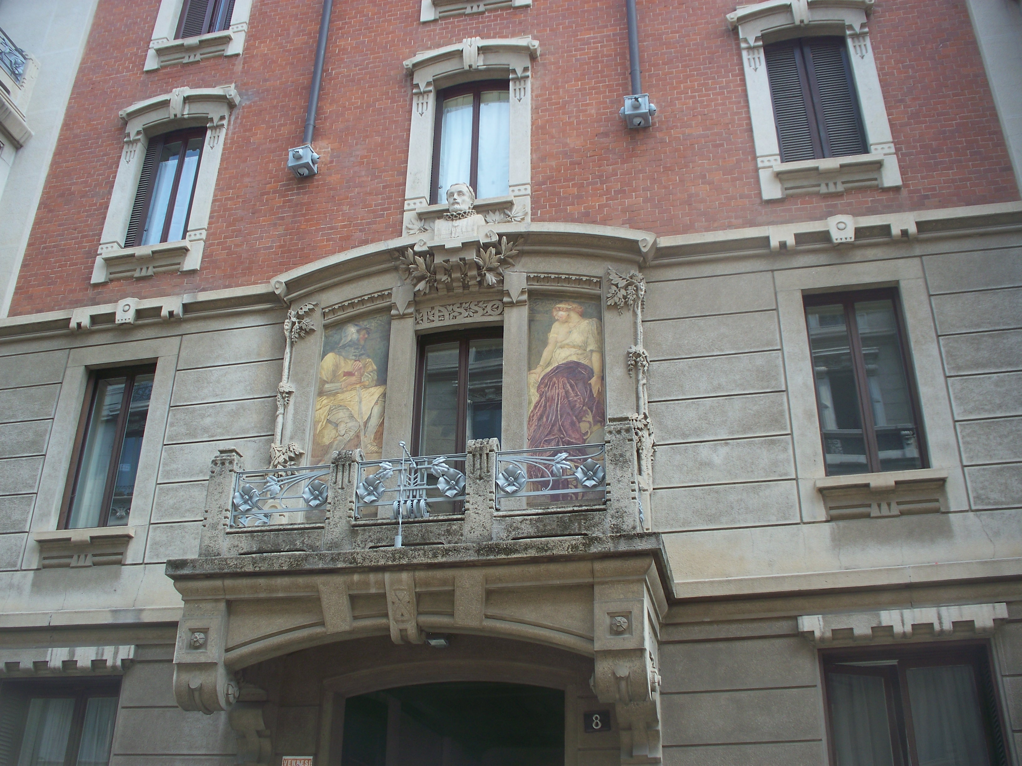 In via Ariosto ci troviamo immersi quasi in una rivista di architettura Liberty, ricca di atmosfera. Sfogliamo le diverse pagine: al numero 21 fermiamoci davanti a Casa Cavalli – Agostoni (1908), dove figure di donna, le quattro Stagioni, danno movimento tra decorazioni floreali e ferri battuti.