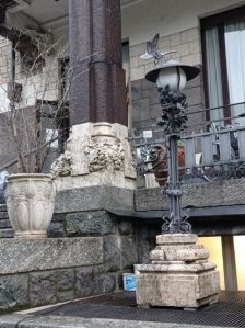 Sopra un lampione, la famosa libellula in ferro battuto del grande Alessandro Mazzucotelli, sembra sorvegliare l’ingresso.