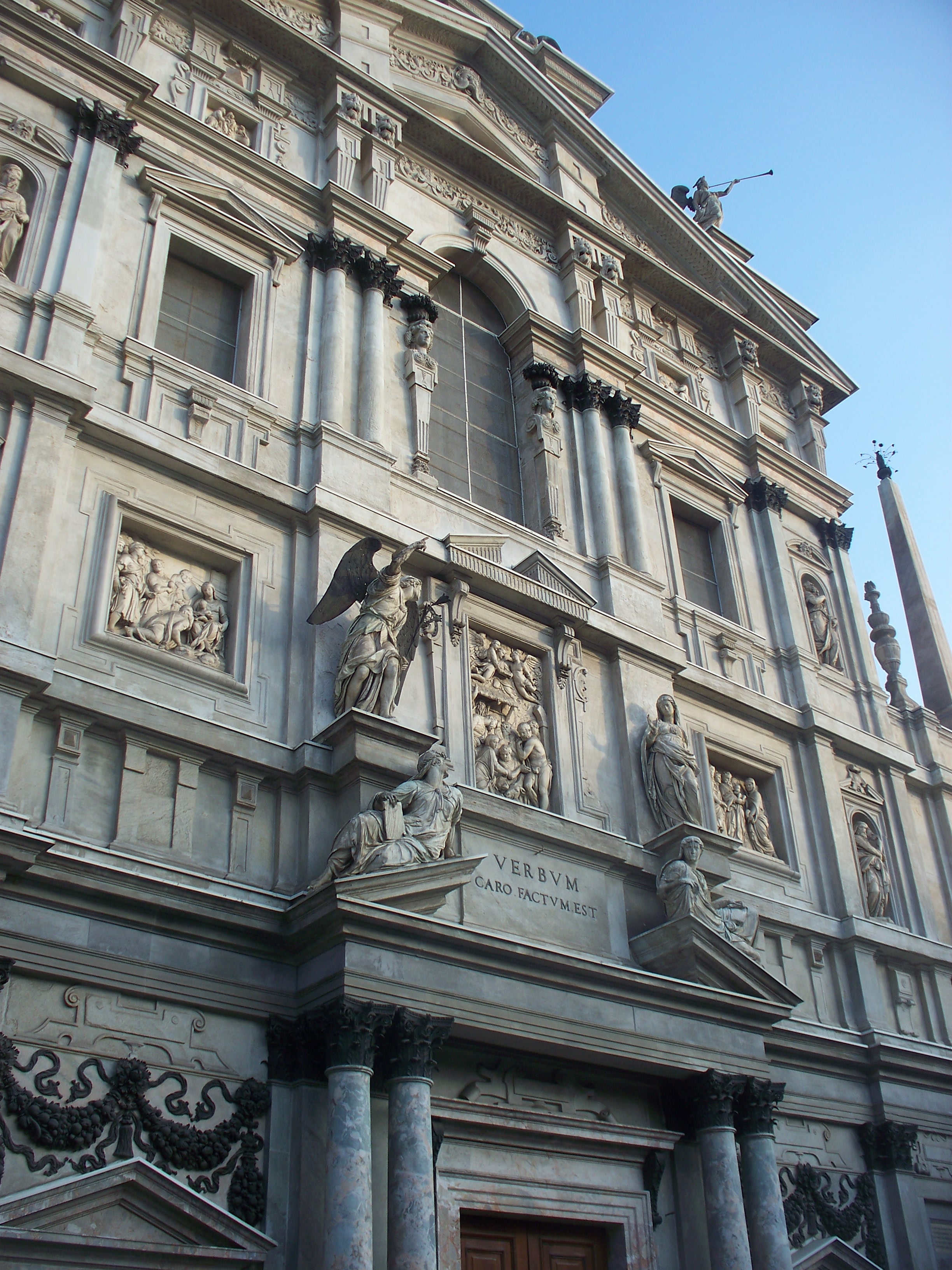 Torniamo davanti alle facciate delle nostre due chiese. Mentre quella di San Celso è visibile da corso Italia, il santuario di Santa Maria risulta parzialmente nascosto, agli occhi di un passante distratto, per la presenza del muro di cinta del quadriportico.