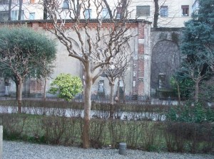 Da questo quadriportico possiamo anche vedere il piccolo giardino davanti a San Celso con i resti delle arcate che facevano un tempo parte della basilica. Infatti questa chiesa è stata abbassata e accorciata per fare più spazio al santuario, che diventava sempre più importante.