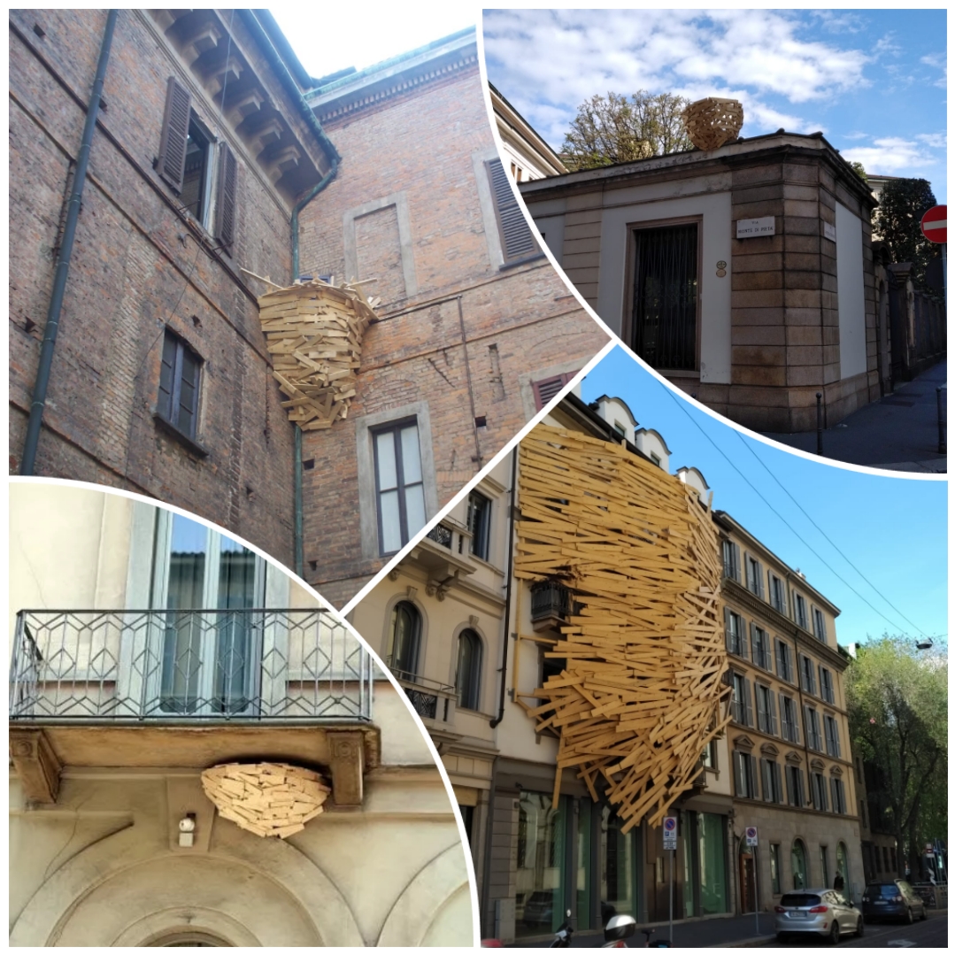Se passeggiamo tra via Monte di Pietà e Brera, troviamo, abbarbicati a edifici storici, quattro “nidi” in legno, interpretati dall’artista giapponese Tadashi Kawamata per la mostra “Nests in Milan”. Le tradizionali linee architettoniche degli edifici su cui sono collocati sembrano quasi in contrasto con questi nidi fatti di semplici listelli di legno d’abete, avvitati tra loro.