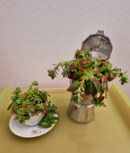 Il Sedum palmeri vive bene all’aperto; in casa i rametti si allungano e si assottigliano rischiando di spezzarsi. E’ una pianta così generosa, però, che a volte stacco qualche rosetta e con una tazzina un po’ sbreccata, una vecchia caffettiera e un po’ di terra, creo un angolino verde in cucina o su un tavolino.
