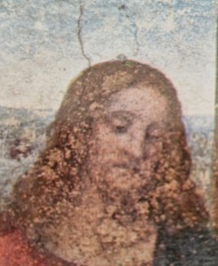 Contrariamente alla tradizione, non c’è aureola, ma è la luce stessa del giorno che sta calando a illuminare il suo capo. O da lui che si diffonde la luce di questo giorno che va verso la fine? Occhi e bocca sono socchiusi, il volto immerso nel dramma del prossimo sacrificio, ma quasi sereno nella sua accettazione. Il Vasari scrive che il viso di Gesù venne dipinto per ultimo e lasciato volutamente “imperfetto” perchè era impossibile dipingere “quella bellezza e celeste grazia… de la divinità incarnata”.