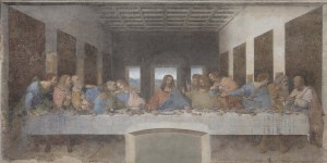 Osserviamo le sue mani, che hanno posizioni quasi contrastanti: la destra esprime tensione, sembra quasi contratta e ci ricorda quella di Maria nella prima versione della Vergine delle Rocce; la sinistra è aperta, col palmo rivolto all’insù ed è accostata a un pane e a del vino.