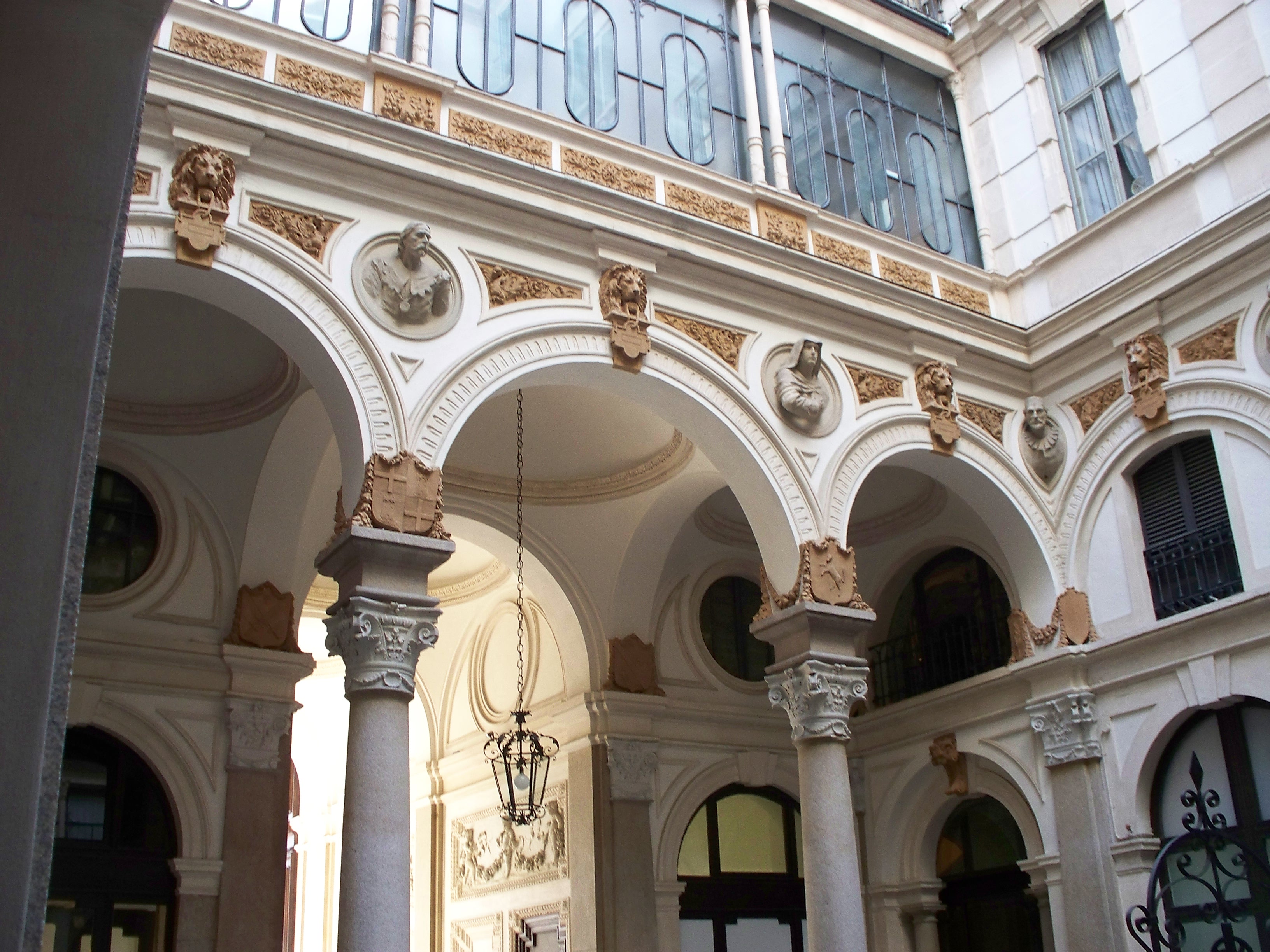 Nel cortile ci sono medaglioni in terracotta con i volti dei personaggi del romanzo manzoniano e alcune colonne provenienti proprio dal Lazzaretto e salvate dalla distruzione dal costruttore del palazzo.