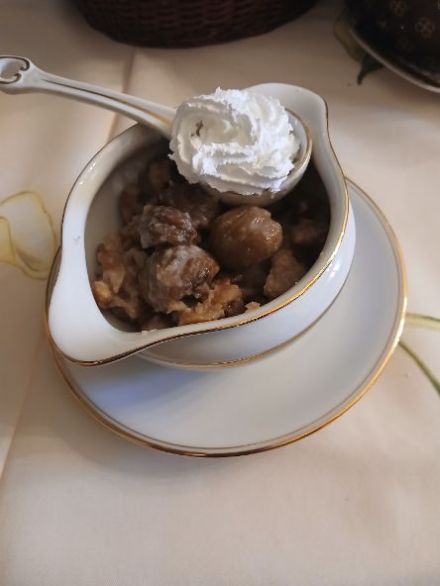 Se si volesse render più facile un po’ la preparazione, comperiamo delle castagne già sbucciate. Il profumo delle castagne inonderà comunque la nostra casa. I grandi potranno aggiungere un po’ di cognac e i bambini qualche goccia di cioccolato. Noi l’abbiamo portata in tavola nella salsiera di un vecchio servizio delle feste… ma con la panna spray.