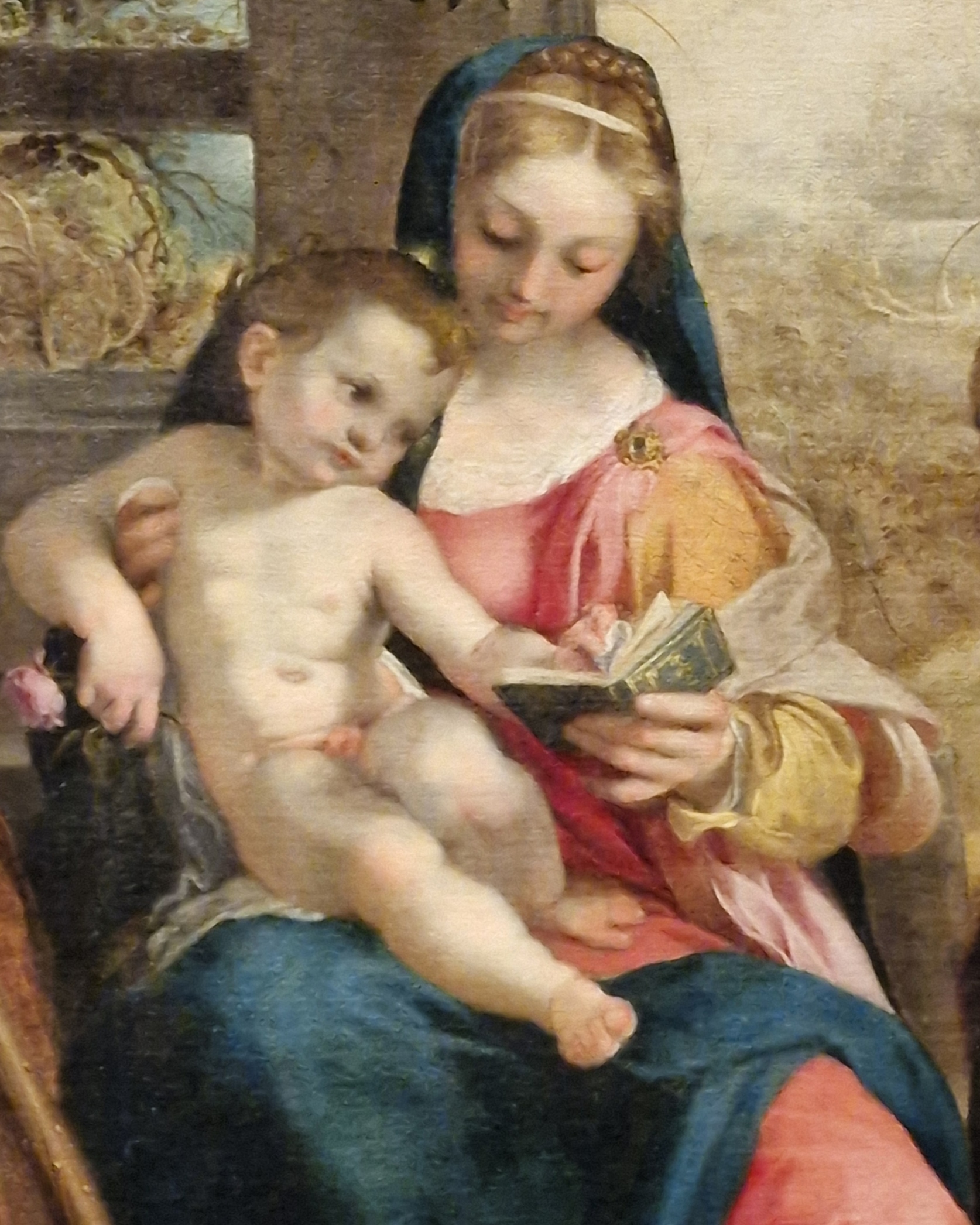 In quest’opera, realizzata nel 1566/67, quasi cento anni dopo quella del Botticelli, una tenerissima Maria tiene in braccio il Bambino, nudo e sgambettante. I loro sguardi sono chini su un libro, in una immagine quanto mai potente, ma dolcemente familiare.