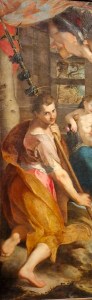 Giuda Taddeo non è rivolto verso il centro della scena, ma sembra voler quasi “agganciare” il nostro sguardo, per coinvolgere lo spettatore. E’ forse l’Amore, nelle sue diverse espressioni, la risposta alle difficoltà del nostro vivere? Osserviamo Gesù Bambino che tiene in mano una rosa, fiore pieno di spine, ma bellissimo e simbolo di amore.