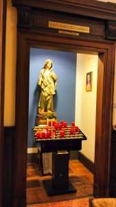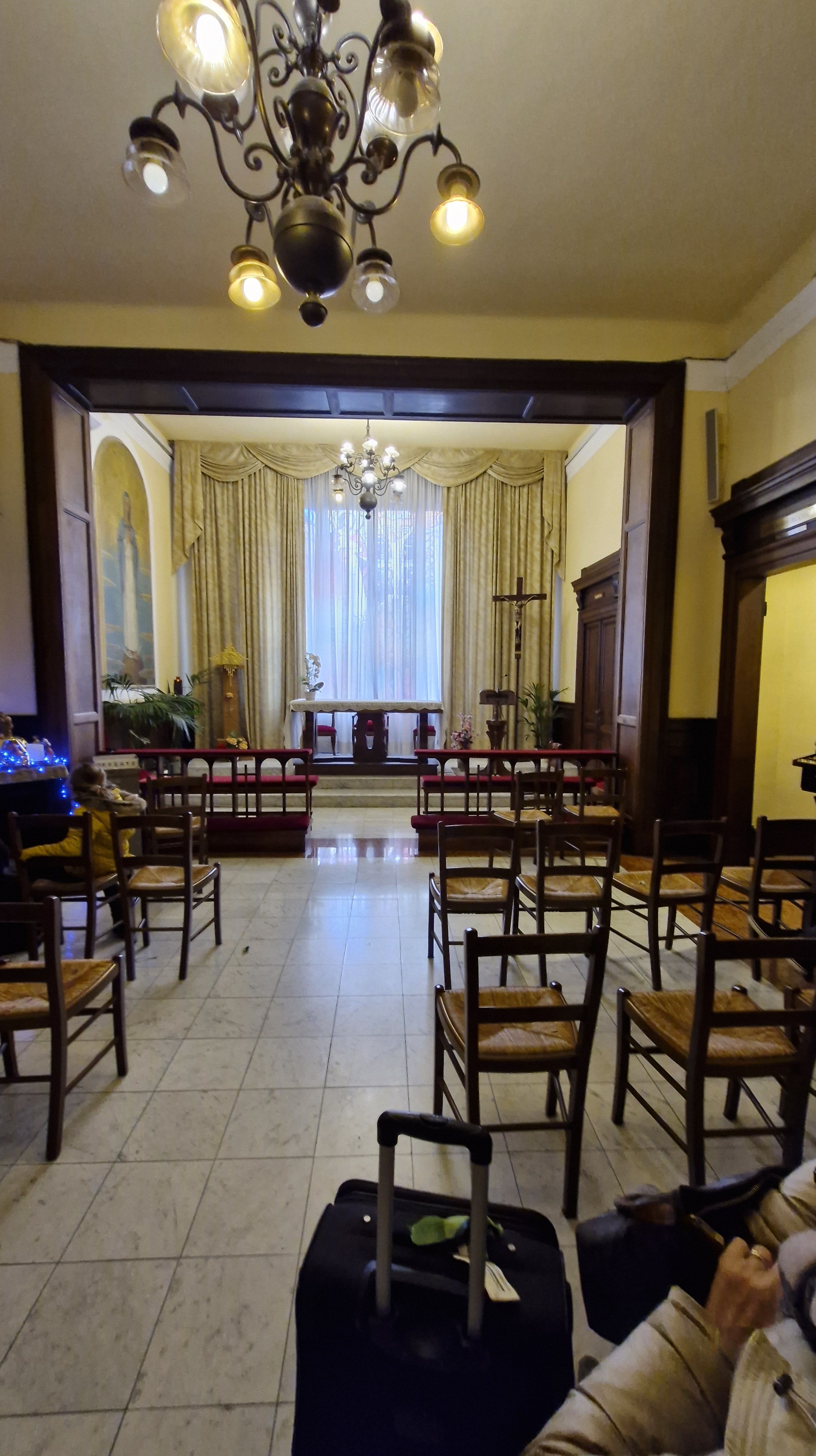 La piccola cappella ha l’aspetto familiare di una stanza un po’ vintage, con tendaggi che lasciano trasparire una vetrata istoriata, un bel lampadario, qualche inginocchiatoio e alcune sedie dove possono trovare un attimo di pace i viaggiatori.