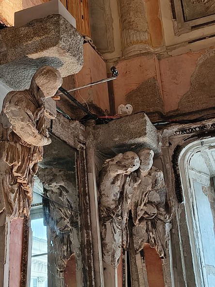 Alle pareti di questa grande e sontuosa sala espositiva, le Cariatidi, figure femminili in pietra provenienti dalla Storia (le donne di Carie) e dal Mito, sono granitici simboli degli oltraggi, soprusi, violenze subiti nel corso dei secoli dalle donne. In particolare le Cariatidi in questa sala portano sui loro corpi le ferite delle bombe che le hanno colpite nella seconda guerra mondiale, lasciate volutamente come erano.