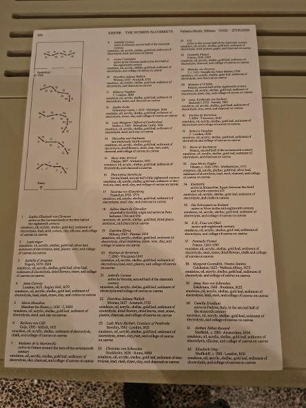 In questa mostra non ci sono indicazioni per conoscere qualcosa di più delle opere e del percorso umano di queste donne, quasi le alchimiste facessero parte di un unico, più grande “Sapere” e si lascia al visitatore, se lo desidera, approfondire le loro vite e il loro pensiero.