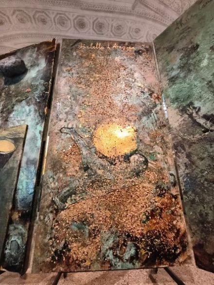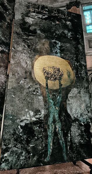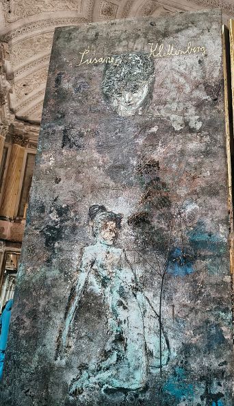 Lungo il percorso quasi labirintico di questa mostra si incontrano teleri dedicati a donne, il cui nome è scritto in oro, di epoche diverse. Ci sono filosofe, scrittrici, “proto scienziate”… e anche due regine, come Barbara von Cilli, regina di Ungheria e Boemia, (1392-1451), definita la “Messalina di Germania” o la “Regina nera” per i suoi legami con la magia nera.