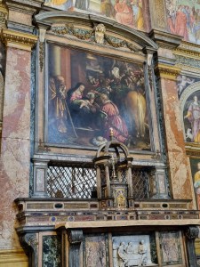 Si ritiene che questa grata, prima della Controriforma, fosse molto più grande e che sia stata ridotta alle dimensioni attuali murando la sua parte superiore, dove ora si trova un grande quadro con l’Adorazione dei Magidi Antonio Campi.