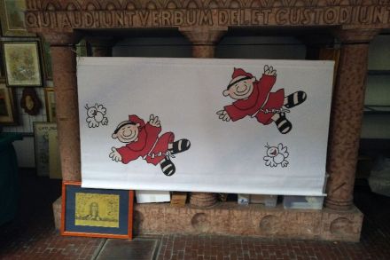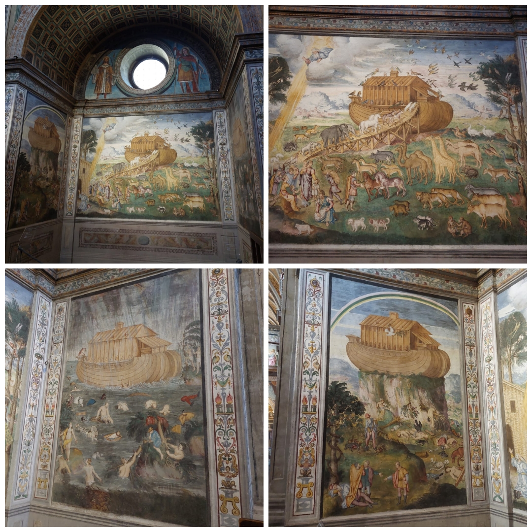 In una cappella una serie di scene bibliche è dedicata al Diluvio Universale. Gli animali (compresi due mitici unicorni!) salgono a coppie sull’Arca. Guardiamo, però, in basso a sinistra: i cani sono tre!!! Sembra che il terzo sia una sorta di logo usato dall’autore del dipinto…