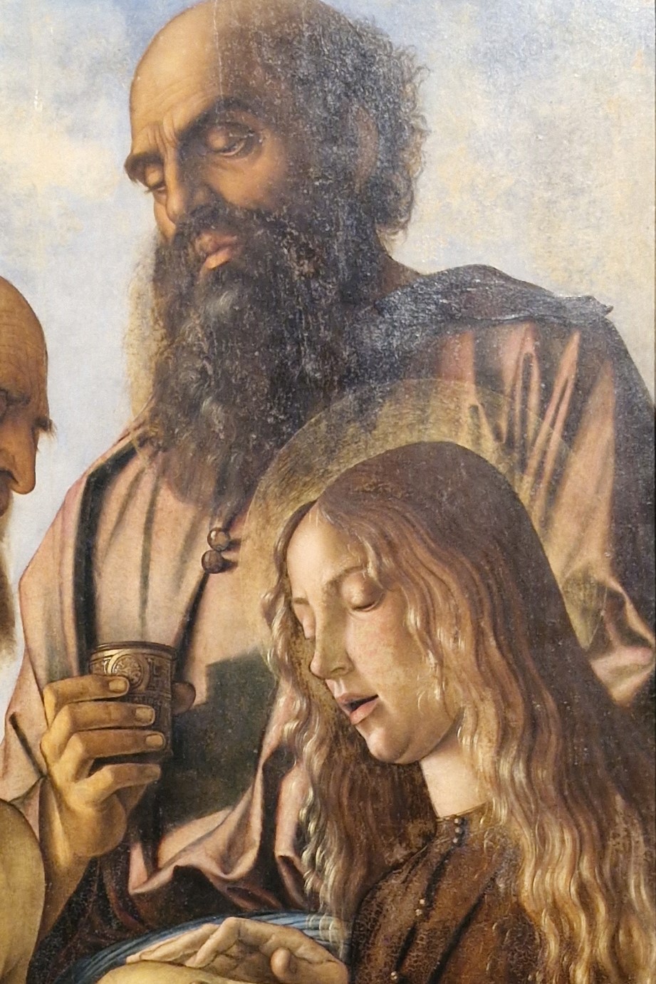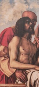 In questa Pala, invece, il Sacrificio si è ormai compiuto; questo è il tempo della pietà, del Compianto (piangere insieme), dell’estremo saluto con un gesto di amore e di speranza che va oltre la morte.