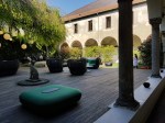Entriamo dall’unico portoncino di legno: subito notiamo il contrasto tra la navata riccamente affrescata e l’abside semicircolare (aggiunta nel 1965), tutta dipinta di bianco. Due affreschi, rimossi a strappo dalla navata, interrompono il suo candore: sono Sant’Antonino, vescovo milanese del VII secolo, e il Beato Ludovico Barbo, che scrisse la Regola della congregazione cassinense. Al centro un Crocifisso ligneo della Val Gardena. Un arcone, che un tempo era la parete di fondo della chiesetta, suddivide ora visivamente abside e navata. Due angeli sollevano drappi rossi e mettono in risalto il piccolo altare in legno e cristallo.