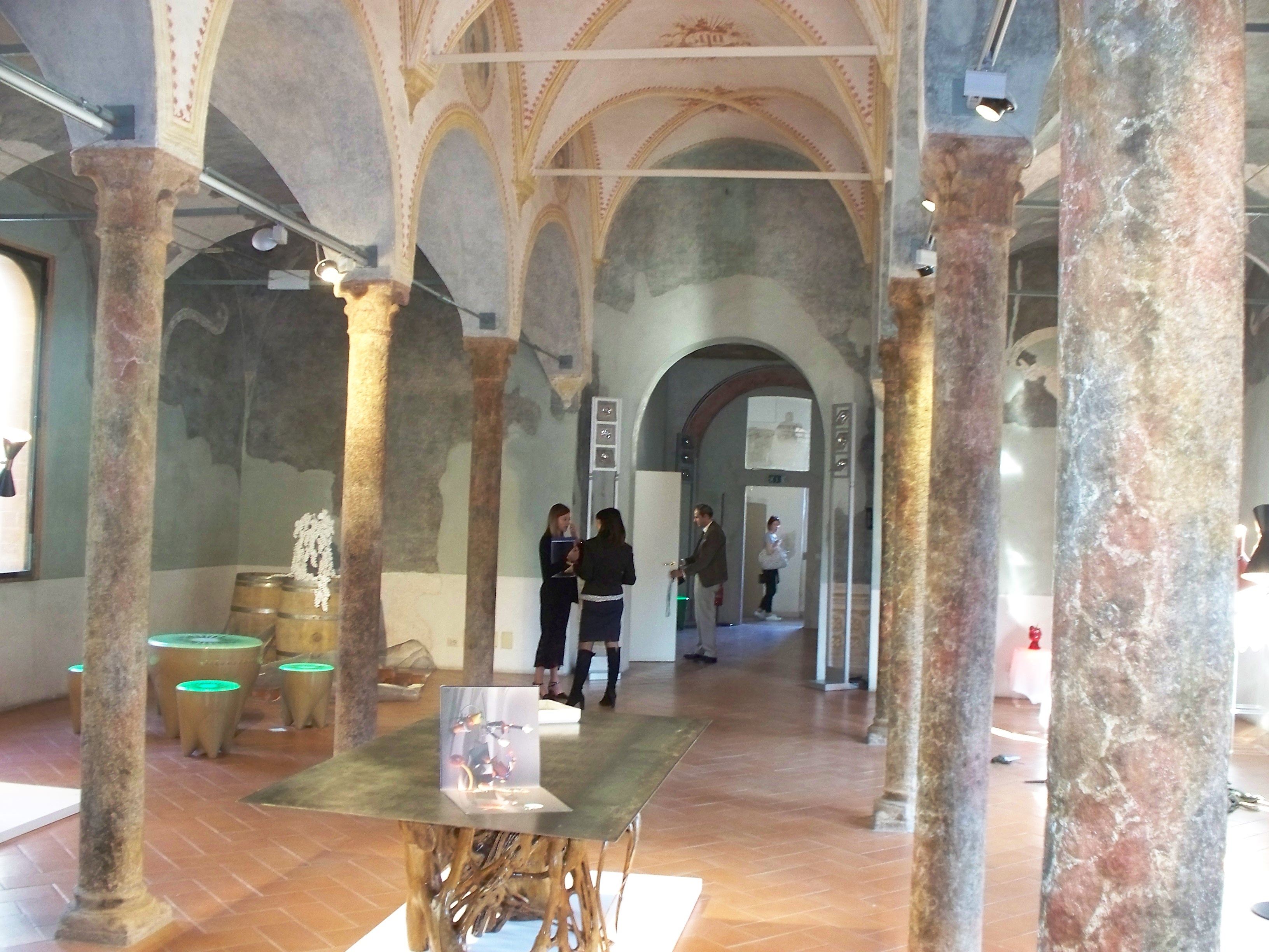 Entriamo dall’unico portoncino di legno: subito notiamo il contrasto tra la navata riccamente affrescata e l’abside semicircolare (aggiunta nel 1965), tutta dipinta di bianco. Due affreschi, rimossi a strappo dalla navata, interrompono il suo candore: sono Sant’Antonino, vescovo milanese del VII secolo, e il Beato Ludovico Barbo, che scrisse la Regola della congregazione cassinense. Al centro un Crocifisso ligneo della Val Gardena. Un arcone, che un tempo era la parete di fondo della chiesetta, suddivide ora visivamente abside e navata. Due angeli sollevano drappi rossi e mettono in risalto il piccolo altare in legno e cristallo.