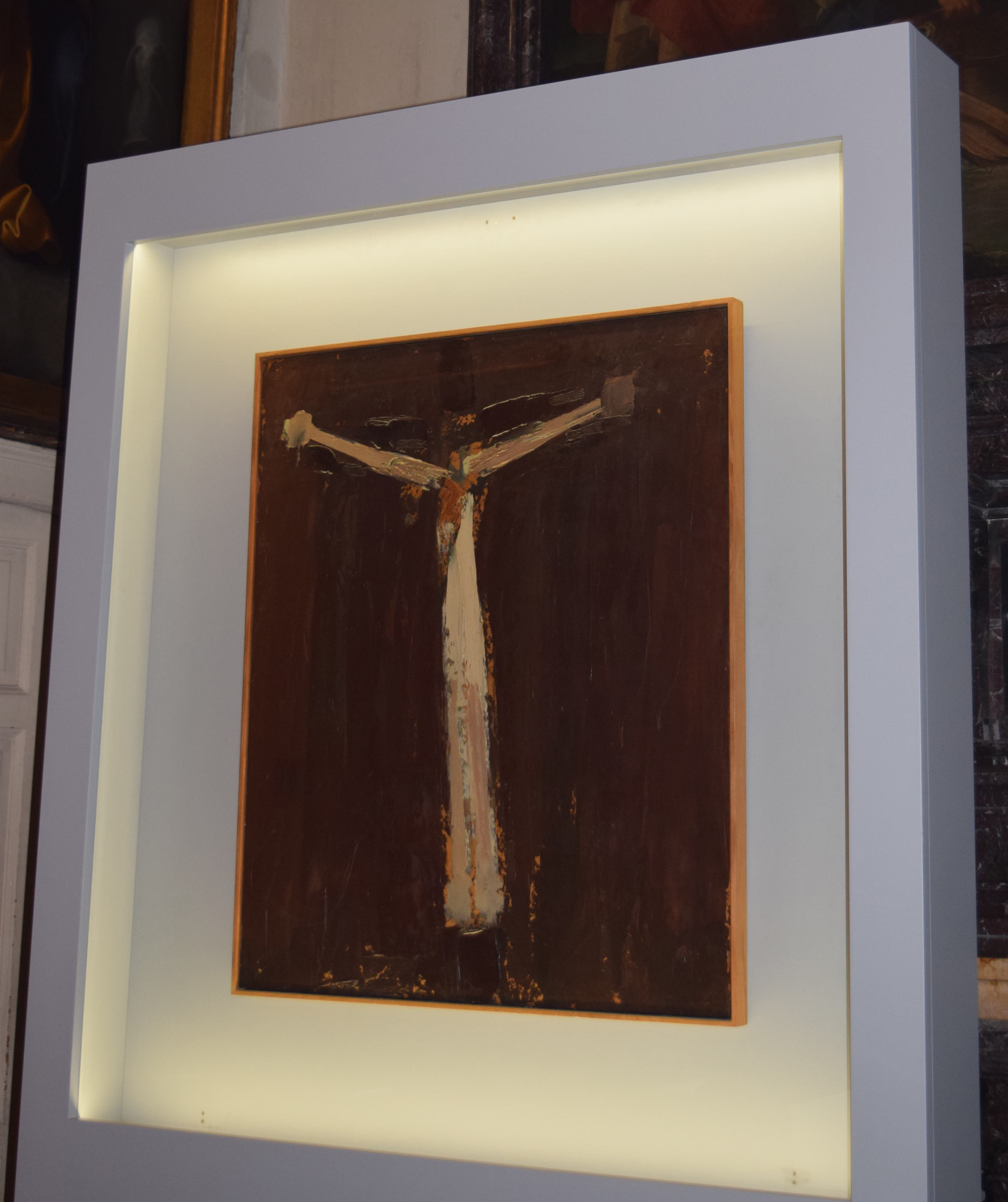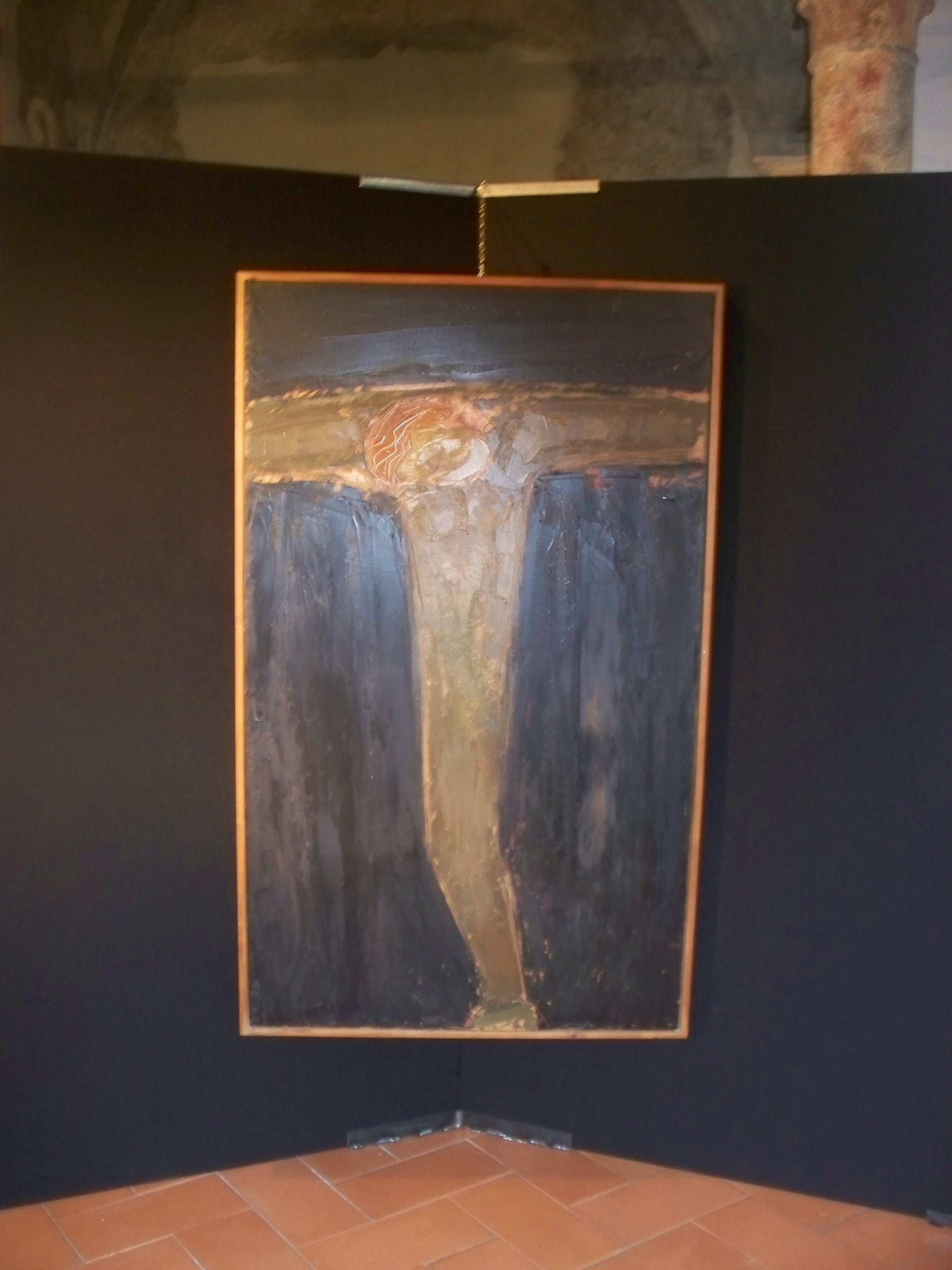 Come un totem, a metà della navata centrale, su una colonna, un serpente di bronzo nero, inquietante nella sua semplicità, disegna un cerchio con il suo corpo.