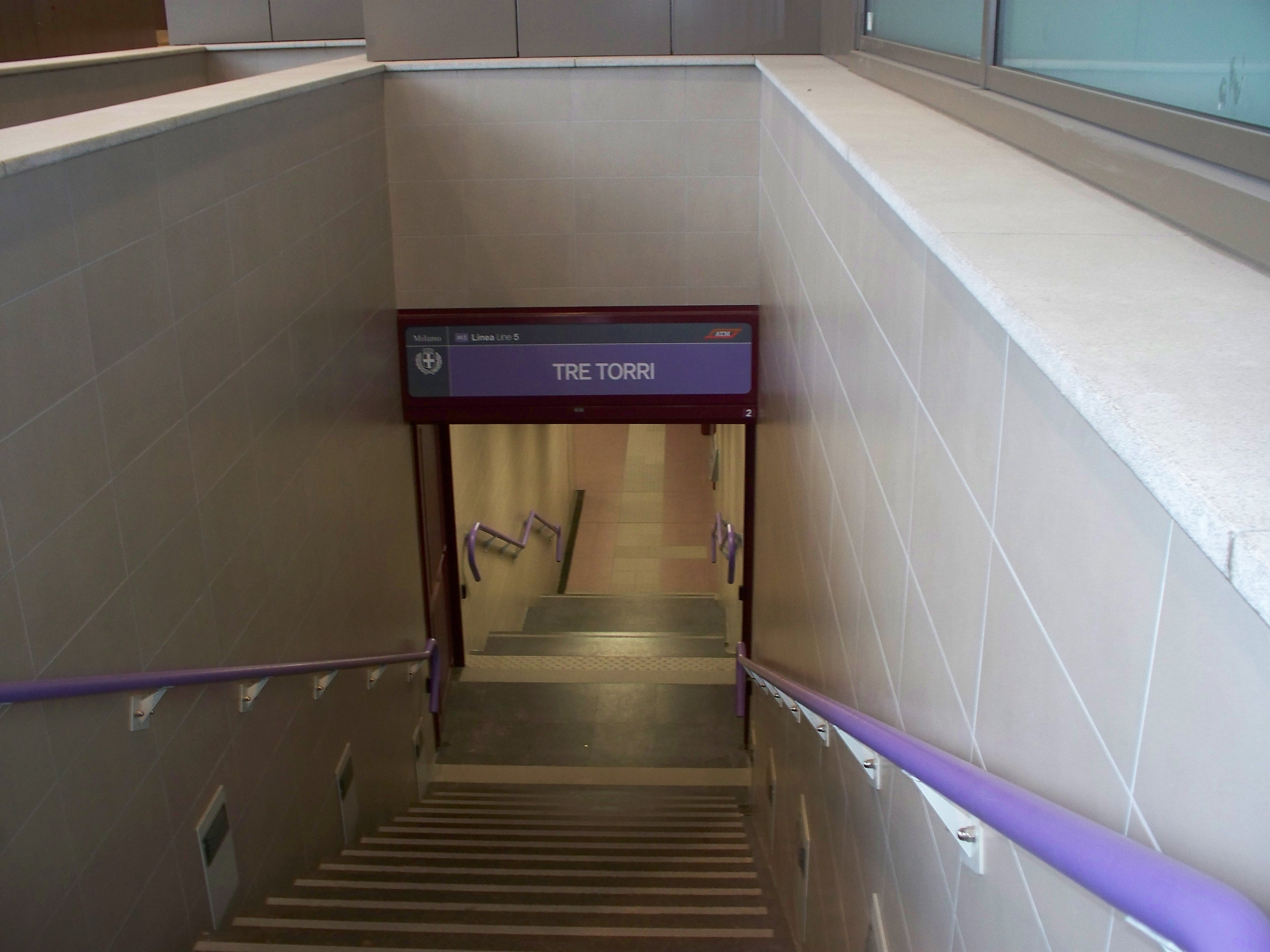 Prendiamo la metropolitana lilla alla Stazione Garibaldi e scendiamo alla fermata Tre Torri. Subito ci troviamo in mezzo a tre imponenti monoliti, il Dritto, lo Storto e il Curvo.