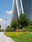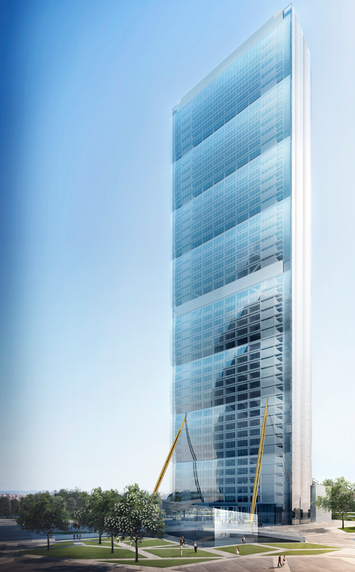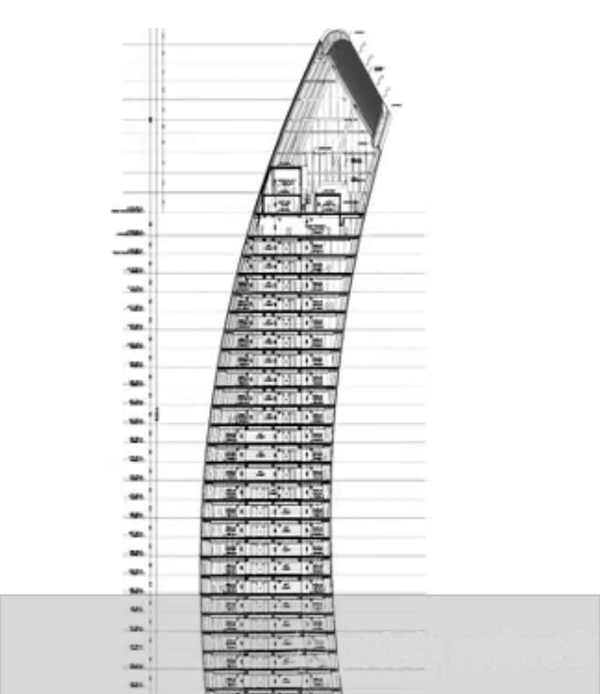 E’ realizzato con moduli che si ripetono, con la superficie curvata come dal vento. Quattro puntoni d’acciaio fissati a terra sono agganciati all’undicesimo dei 50 piani del grattacielo.