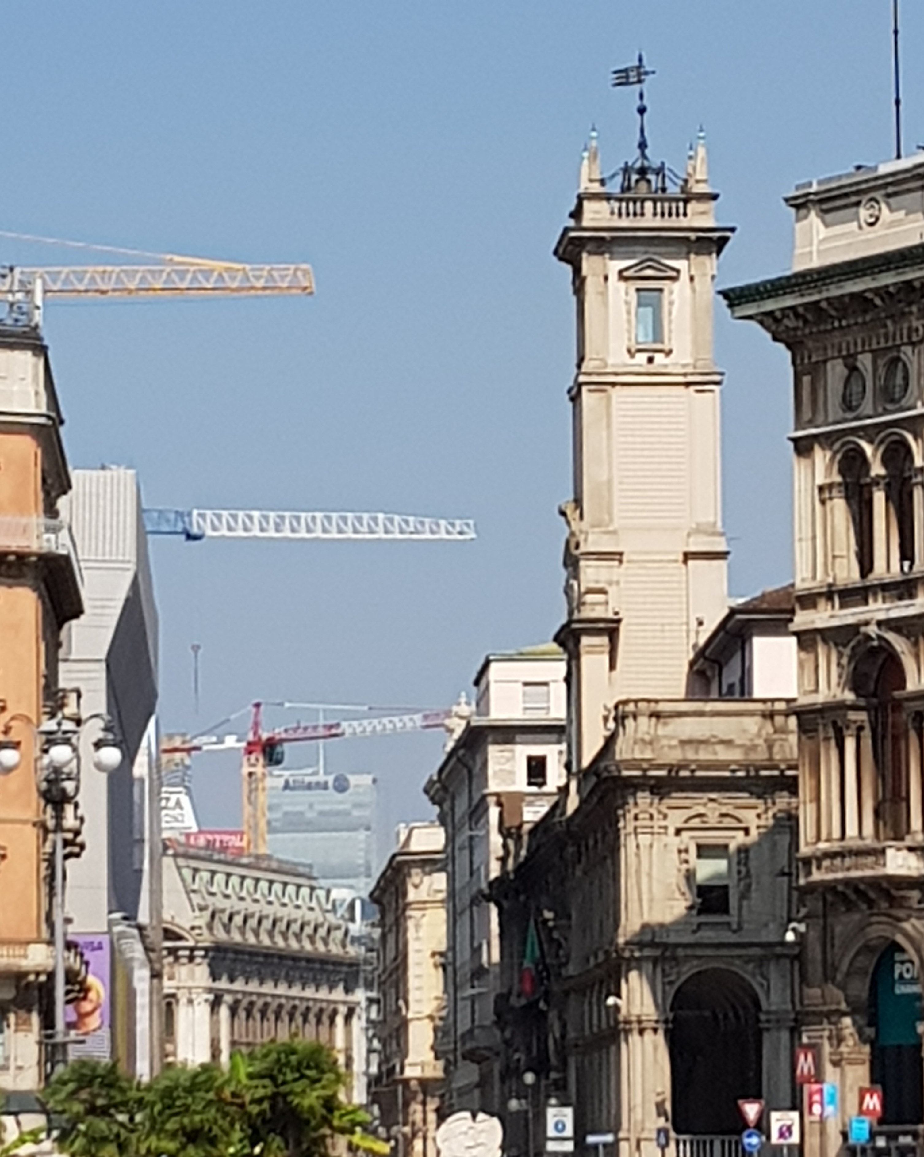Come la guglia di Porta Nuova, così queste torri non sono così lontane dalla storia della nostra città. In questa bella immagine da piazza del Duomo possiamo vedere passato, presente e futuro. Il Dritto, l'”oggi”, sullo sfondo, sembra rispondere all’antica Torre Civica; tra loro una serie di gru sono intente a disegnare il futuro.