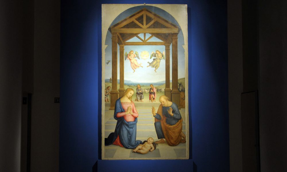 Anche Palazzo Marino è tutto rosso. Come da tradizione ospita un’opera d’arte che è possibile vedere gratuitamente e un bel Presepe umbro nel cortile.