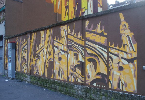 Terminiamo questo nostro piccolo viaggio fra alcuni murales della street art milanese con un addio: in via Carducci una coppietta stava abbracciata su un muro. Ora Leonardo e Monna Lisa sono stati imbrattati di vernice. Vogliamo ricordarli all’ “incontrario”, come se fossero riusciti ad uscire dalla nube di parole che li avvolgeva, per continuare a vivere la loro storia!