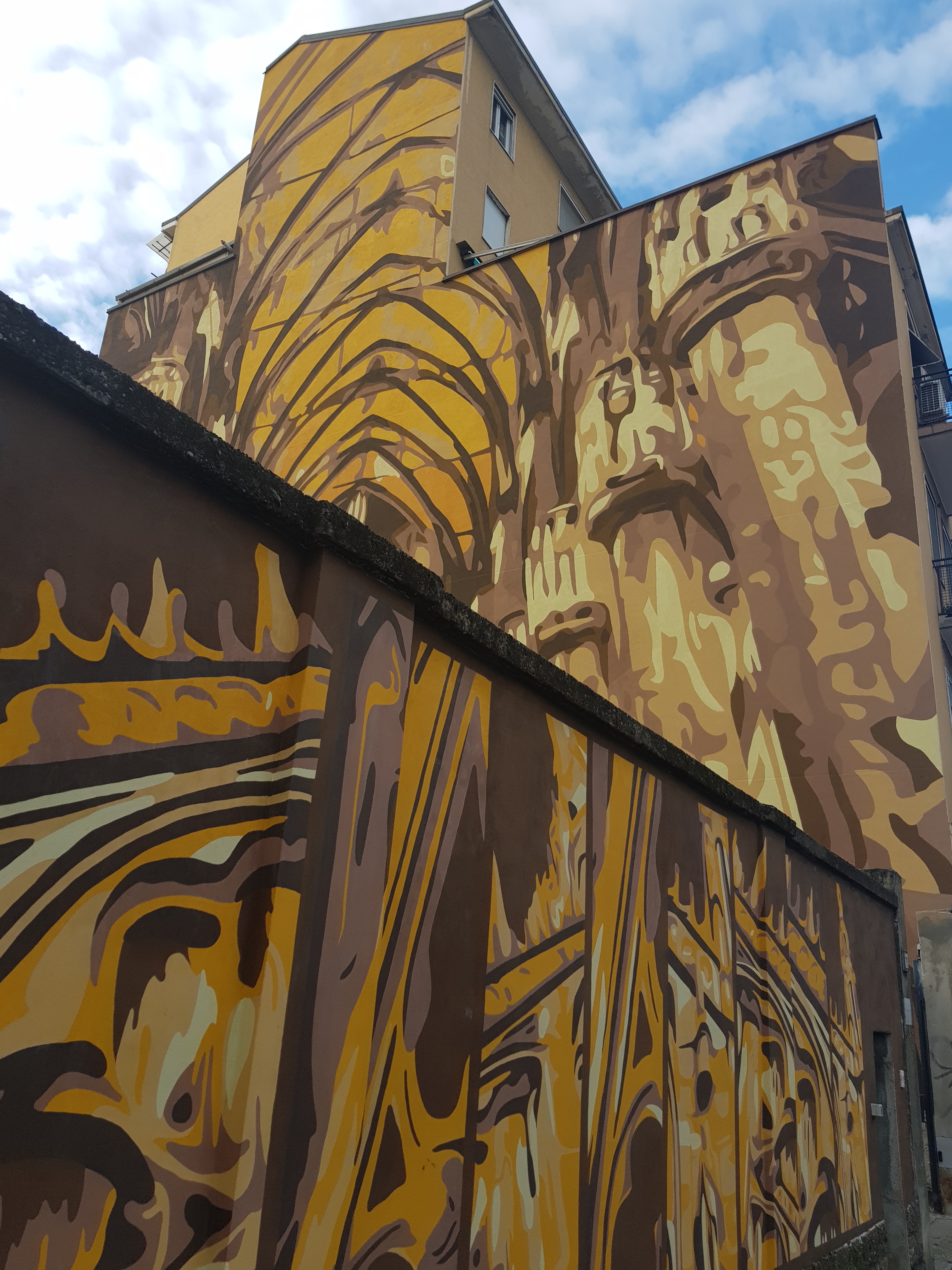 Ci sembra un angolo molto bello dove i murales, che richiamano il tessuto urbano, sono la quinta per definire uno spazio in mezzo alla città, piccolo ma vivibile, da amare.