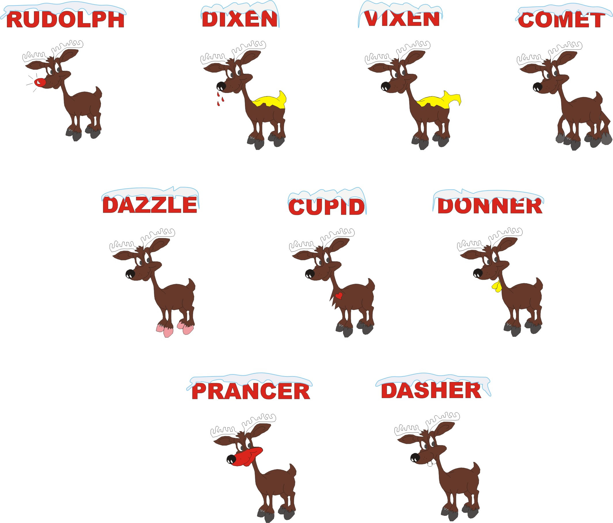 In italiano sono: Cometa, Ballerina, Fulmine, Donnola, Freccia, Saltarello, Donato, Cupido; mentre in inglese: Comet, Dancer (o Dazzle), Dasher, Prancer, Vixen, Donner, Blitzen (o Dixen), Cupid.