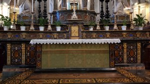 Anche l’altare maggiore, completato nel Settecento, è un mosaico di tessere, marmi e pietre colorate su fondo nero.