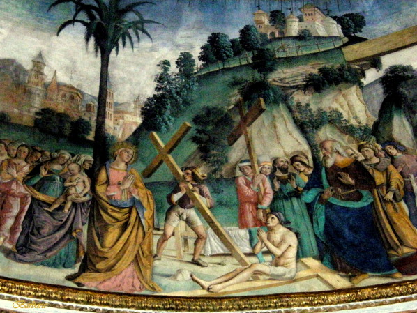 Prima di entrare nella Basilica, guardiamo con più attenzione tra gli alberi; una statua in cima ad una colonna molto alta si nasconde tra i rami. È un personaggio tra i più horror che la fantasia potrebbe immaginare: un uomo in piedi, raffigurato nel pieno delle forze, che ha una grossa lama conficcata nel cranio e sembra non accorgersene.